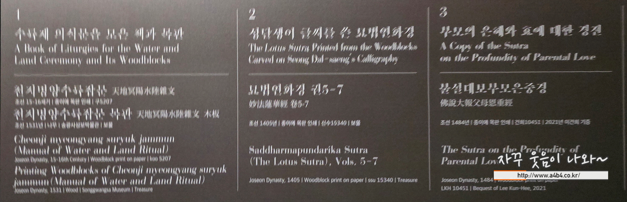 이번 전시회는 총 3개 섹션으로 구성되어 있는데, 마지막 섹션인 조선 전기 불교미술을 다룬 '금金, 변치 않는 기도를 담다' 소개입니다. 이번 전시회에서 가장 화려하고 아름다운 섹션 + 마지막 특별섹션인 훈민정음 소개입니다.
