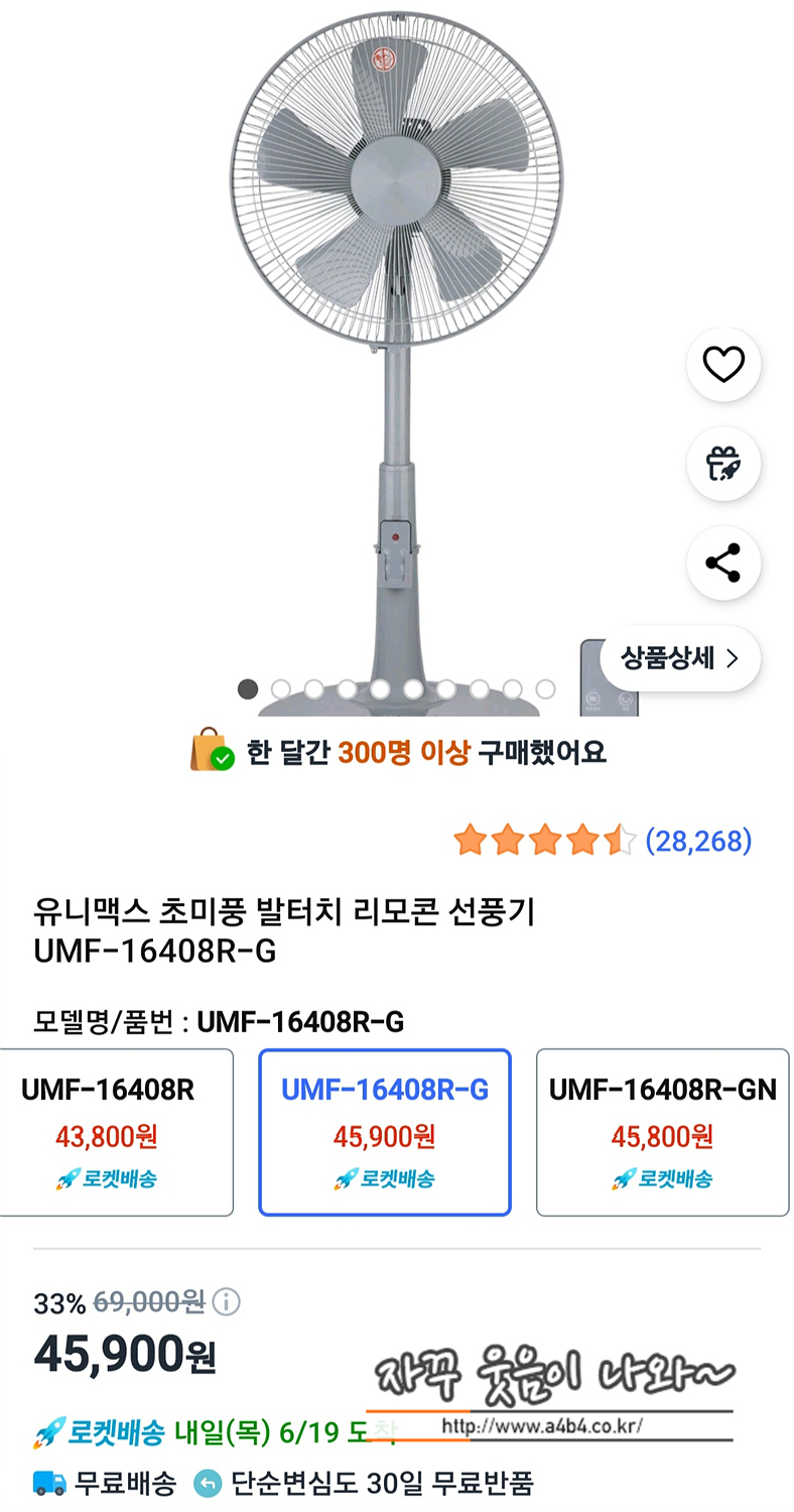 제가 유니맥스 제품을 선택한 이유는 제품명에 있는데요. '유니맥스 선풍기 초미풍 발터치 리모콘 UMF-16408R-G' 입니다.