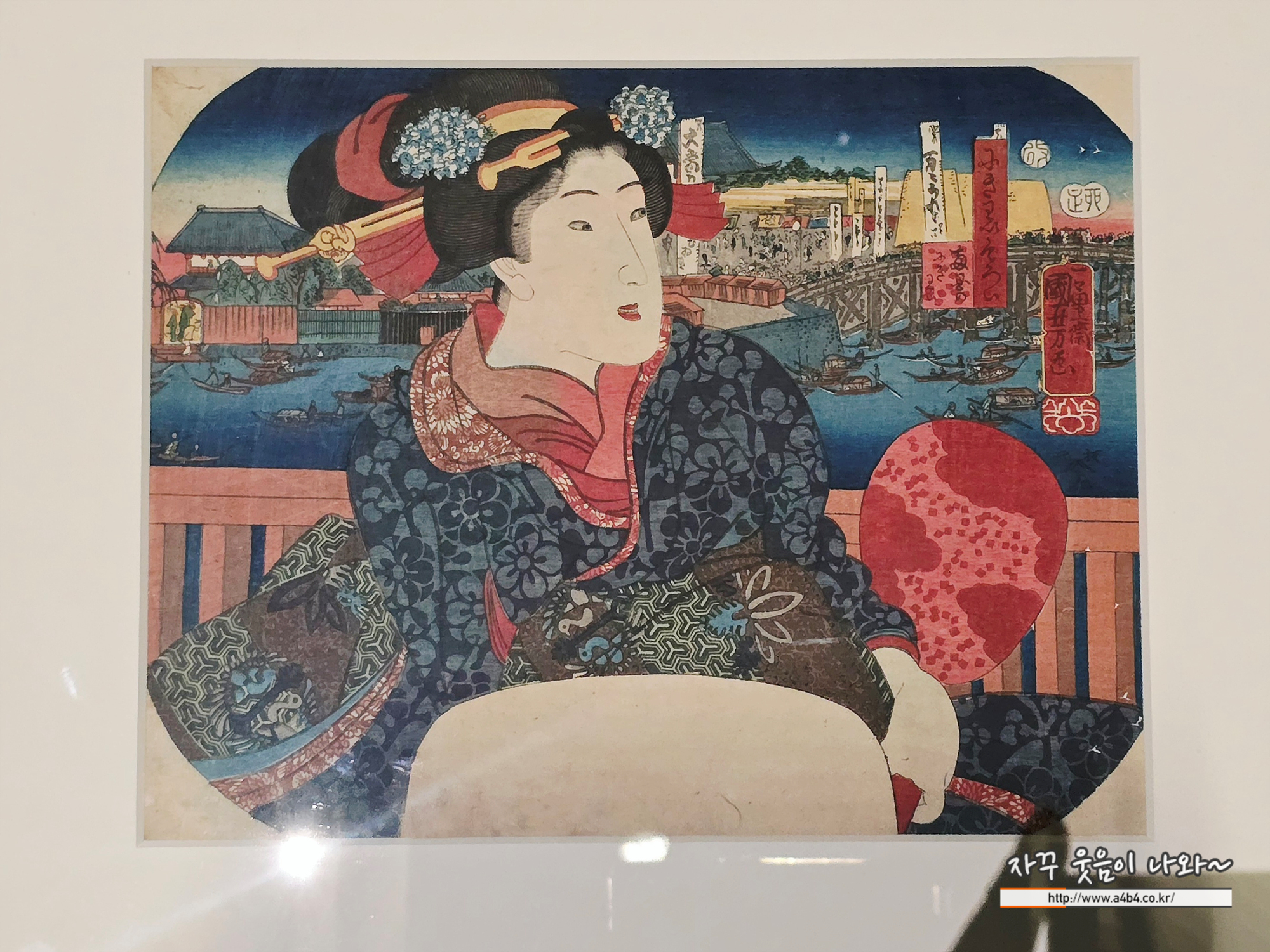 이 작품은 구니요시의 《활기》 연작 가운데 하나로, 우키요에와 부채를 취급하던 도매상 이세야 소에몬(伊勢屋惣右衛門, 생몰년 미상)이 출판을 담당했습니다. 요정 2층에서 젊은 여인이 스미다강[隅田川]의 료고쿠(両国) 다리를 내려다보며 활기찬 풍경을 감상하고 있습니다. 료고쿠는 에도 최고의 번화가였으며, 여름이면 불꽃놀이를 보려는 인파로 붐볐습니다. 이 그림에서도 강에는 지붕 달린 유람선과 쪽배가 떠다니고, 다리 위에는 많은 사람들이 오가고 있습니다. 아마도 여인의 시선 끝에는 이제 막 솟아오르려는 불꽃이 있을지도 모릅니다.
