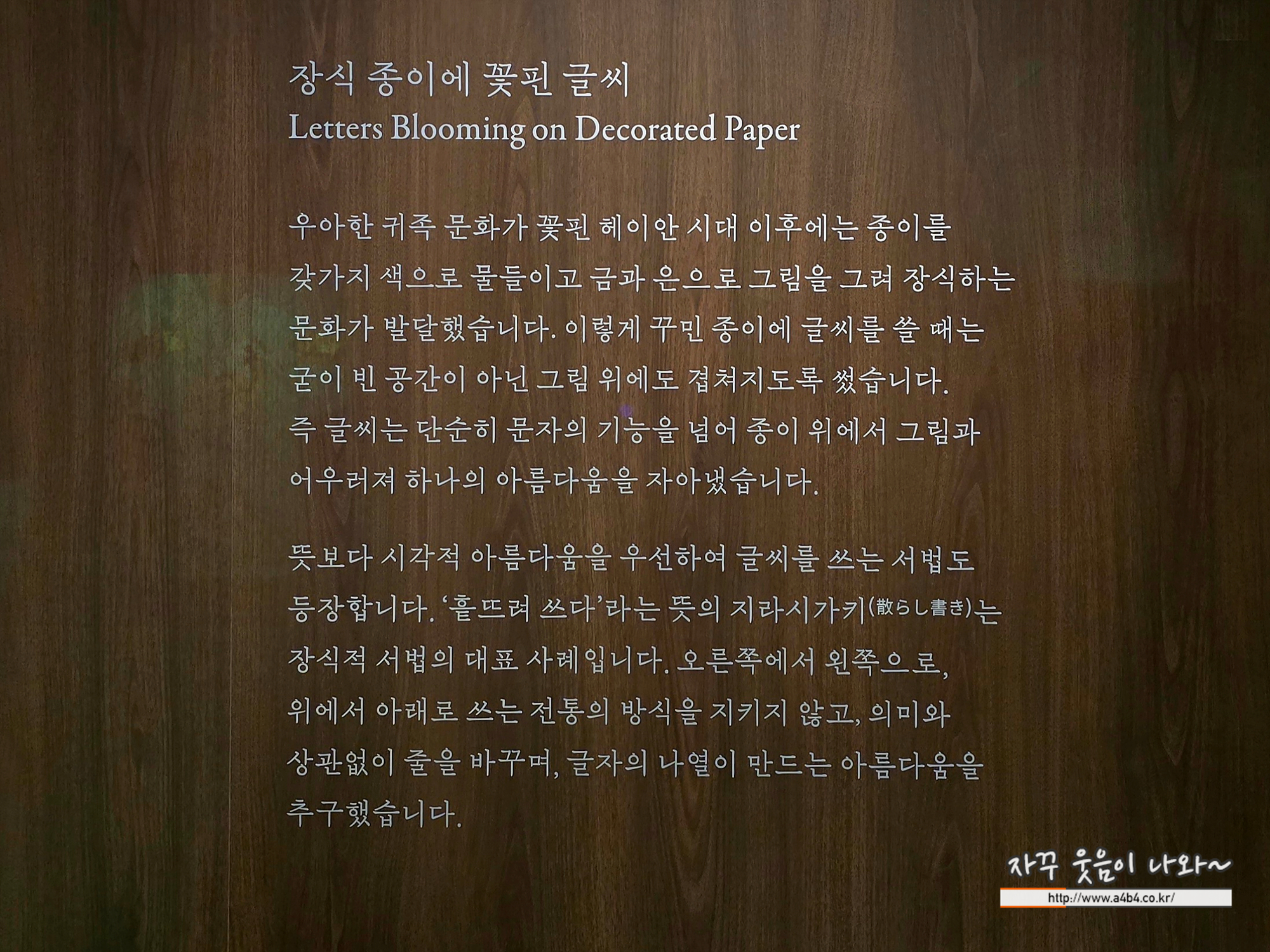 우아한 귀족 문화가 꽃핀 헤이안 시대 이후에는 종이를 갖가지 색으로 물들이고 금과 은으로 그림을 그려 장식하는 문화가 발달했습니다. 이렇게 꾸민 종이에 글씨를 쓸 때는 굳이 빈 공간이 아닌 그림 위에도 겹쳐지도록 썼습니다. 즉 글씨는 단순히 문자의 기능을 넘어 종이 위에서 그림과 어우러져 하나의 아름다움을 자아냈습니다.