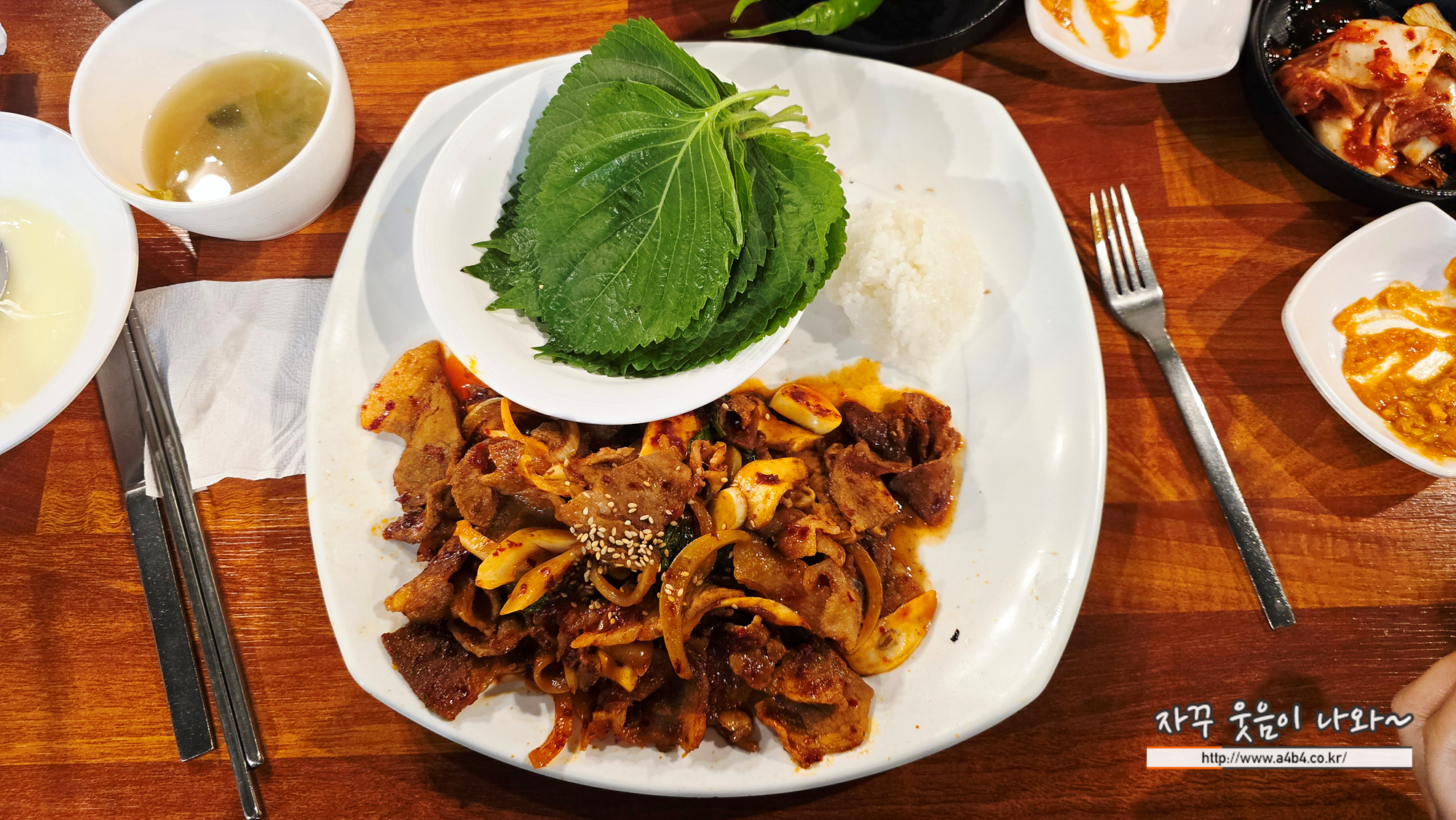 그리고 윤화돈까스 제육볶음에는 상추는 나오지 않고요. 깻잎만 나옵니다. 드래도 쌈 싸먹기 좋더라는...