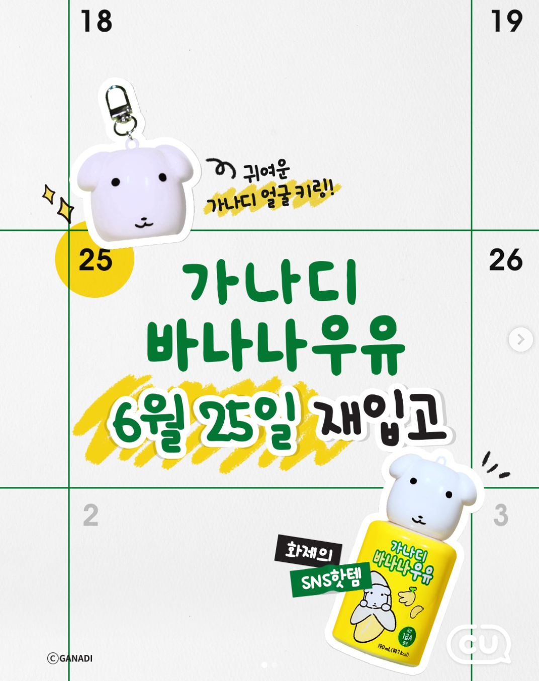 가니디 바나나우유는 매일 CU에 입고되지 않습니다. 보통 5일 단위로 편의점에 재입고 되는데요. CU 인스타그램에서 입고 몇 일전에 입고일 안내가 됩니다. 다만 입고일 아침에 들어올지 오후에 들어올지 저녁에 들어올지는 알 수 없습니다.