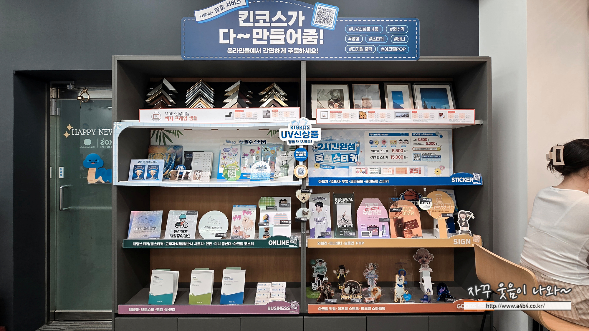 기존 킨코스의 컬러 흑백 디지털 출력은 물론 현수막제작 및 액자, 사진인화, 스티커 제작 등 인쇄와 소품제작 등 많은 업무가 가능합니다.