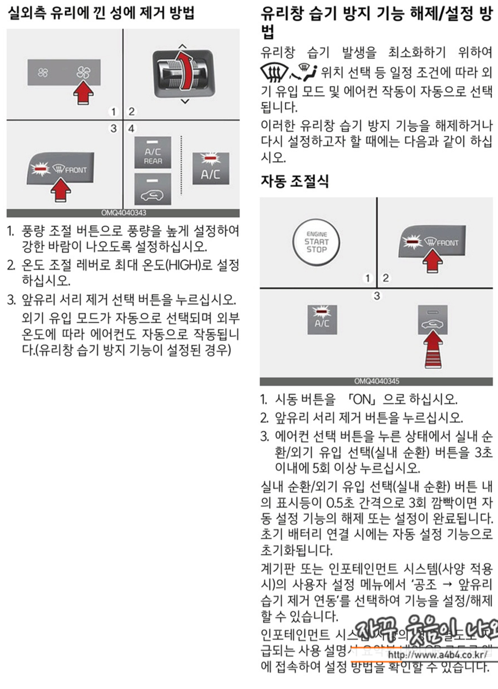 ADS 기능을 이용하지 않고 차량 앞유리에 씬 습기나 성애 제거 방법은 아래 기아 쏘렌토하이브리드 매뉴얼 참고하세요.