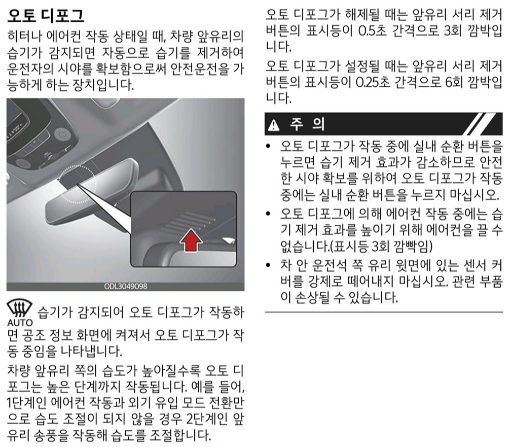 오토 디포그는 차량 앞유리의 습기가 감지되면 자동으로 습기를 제거하여 운전자의 시야를 확보함으로써 안전한 운전을 도와주는 장치입니다.