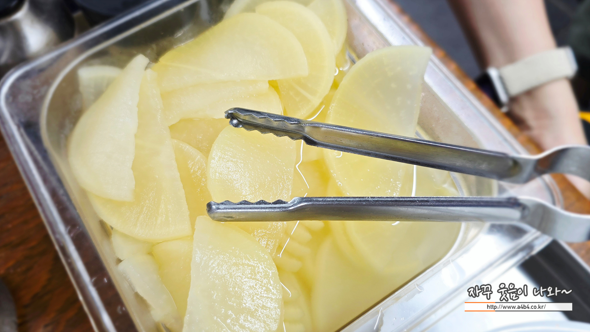 반찬은 단무지 하나, 테이블에 있어 맘 편하게 리필해 드시면 됩니다.