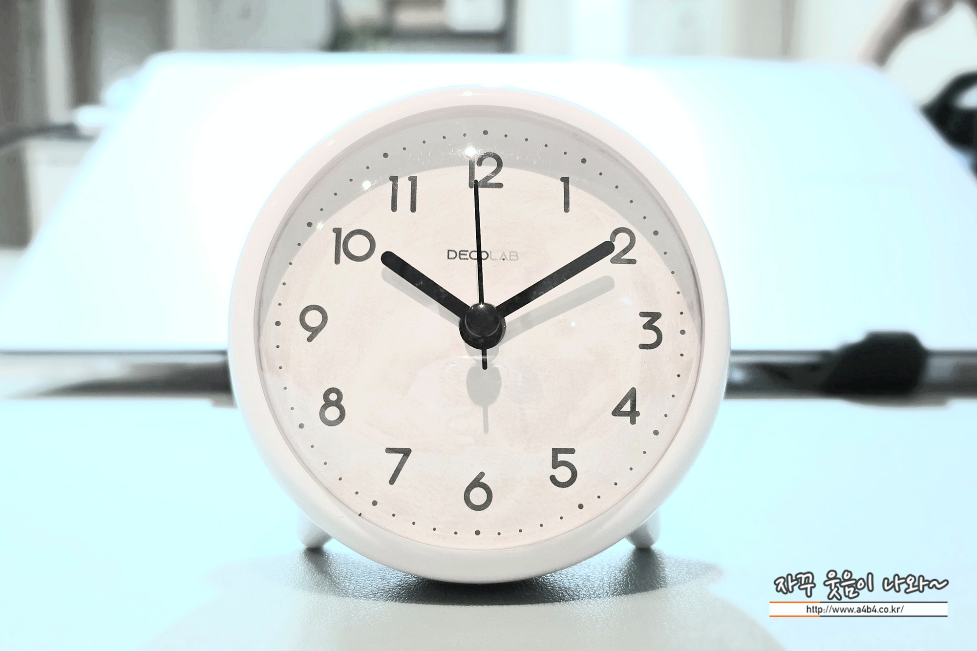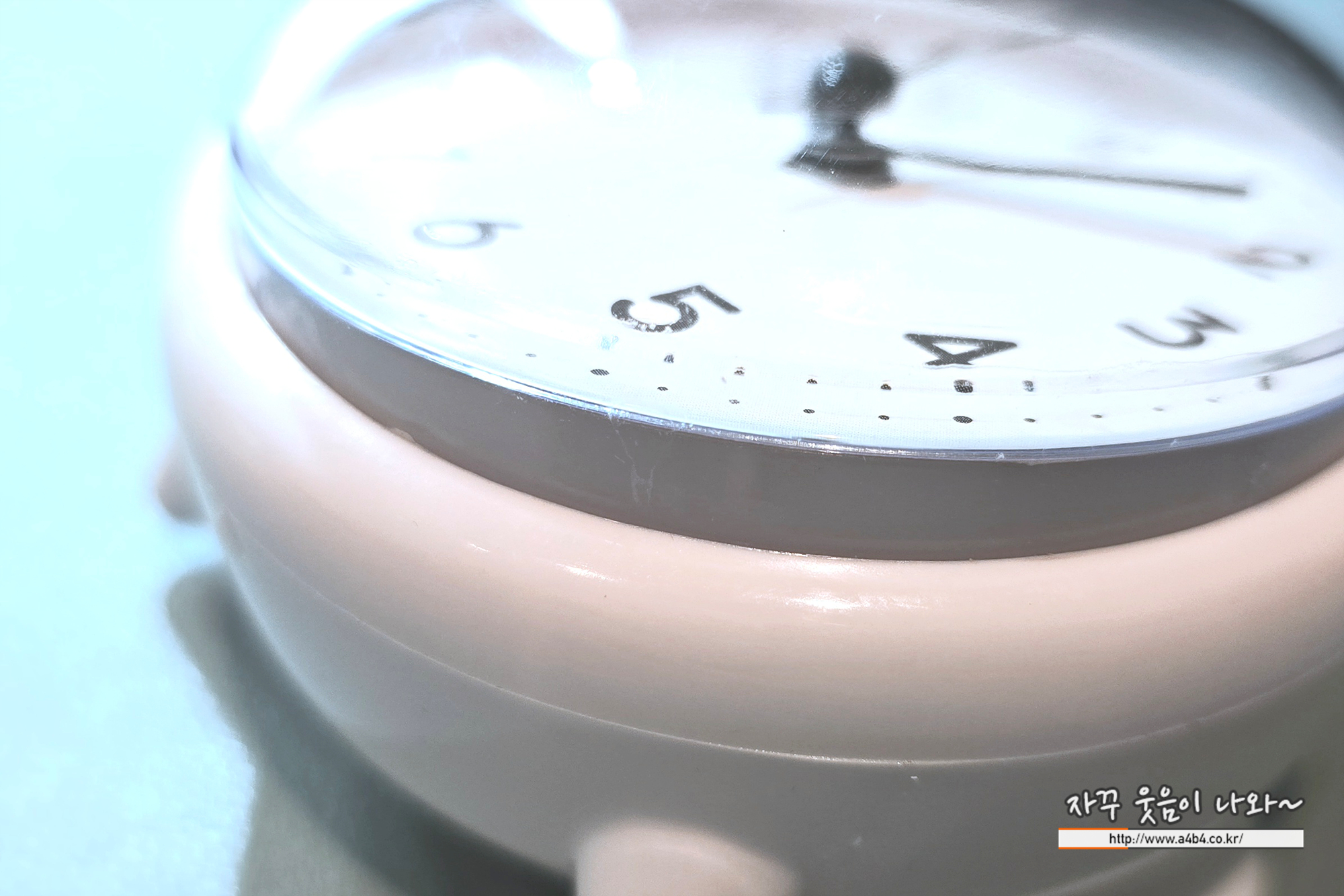 뒤에는 다리가 있어 이렇게 화장실이나 테이블 등에 세워서 사용할 수 있는데, 무소음 시계는 아니다. 화장실에서 응가하고 있으면 초침 넘어가는 소리 잘 들린다. 침실이나 공부방에서는 사용하기는 다소 무리 있는...
