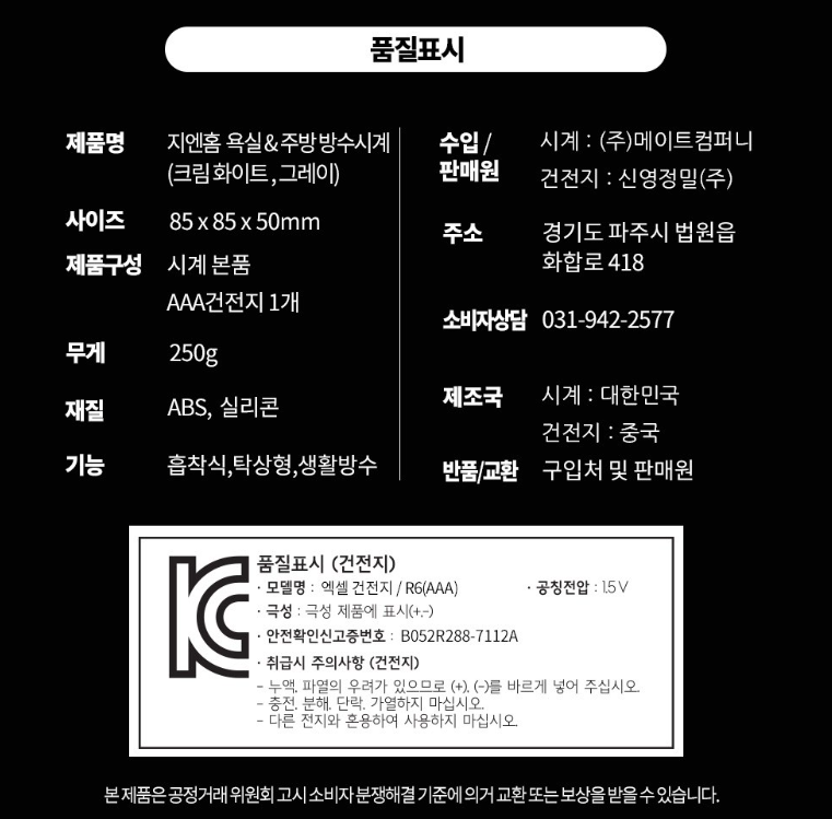 참고로 지엔홈 욕실 주방용 투웨이 방수시계는 AAA 배터리 한 개 사용되며, 기본 중국산 듣보잡 배터리 하나 포함되어 있다.