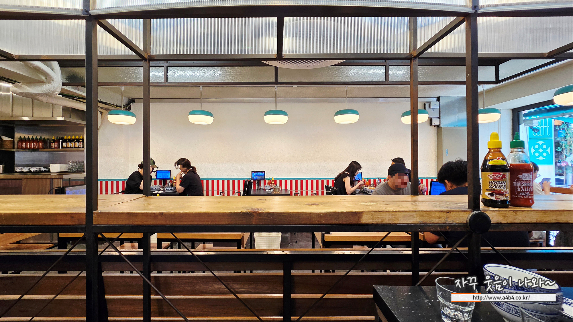 실내입니다. 겉에서는 다소 낡은 건물이라고 생각했는데, 실내 인테리어는 깔끔하고 좋네요. 주로 강남역은 커플들이 많이 방문하다 보니 2인 테이블이 대부분이고요. 4인 테이블은 아주 일부만 배치되어 있습니다. 그래서 일행이 조금 많으면 땀땀 강남 웨이팅이 조금 더 길어질 수 있네요.