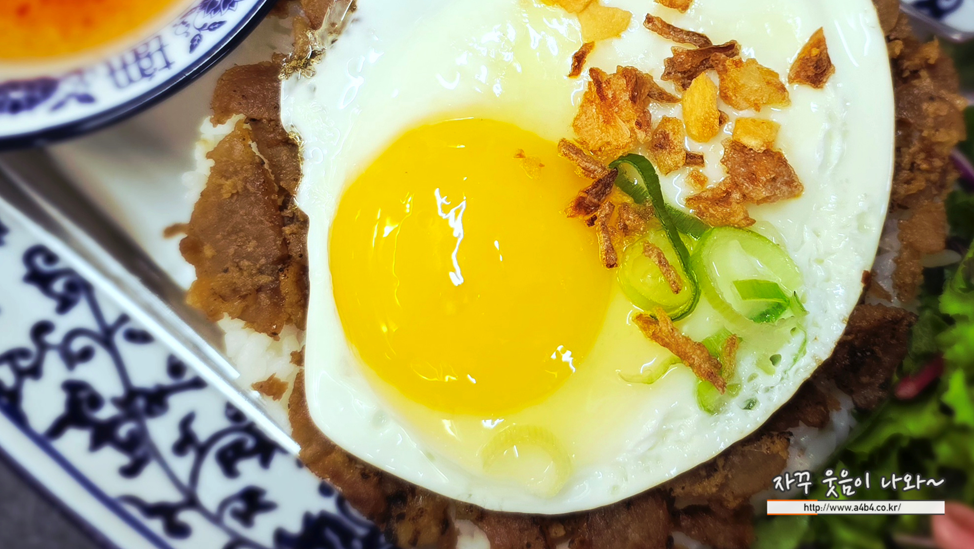 땀땀에서 인기 있는 메뉴 중 하나가 바로 숯불구이 돼지고기 덮밥입니다. 땀땀 음식들이 기본적으로 양이 많고 푸짐하고 국물과 면, 밥이 리필되다 보니, 두 명이 오면 한 명은 베트남 쌀국수를 다른 한 명은 분짜나 덮밥류를 많이 주분합니다.