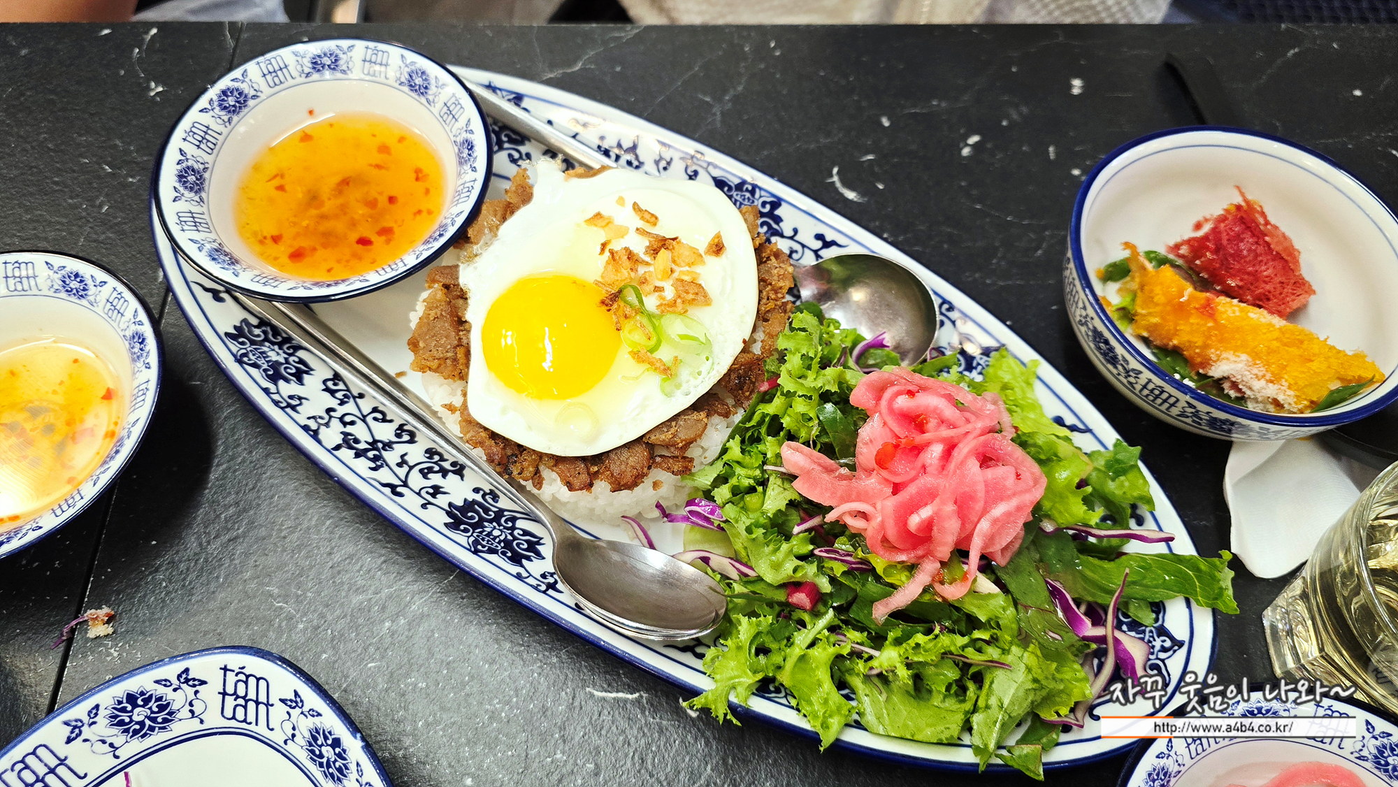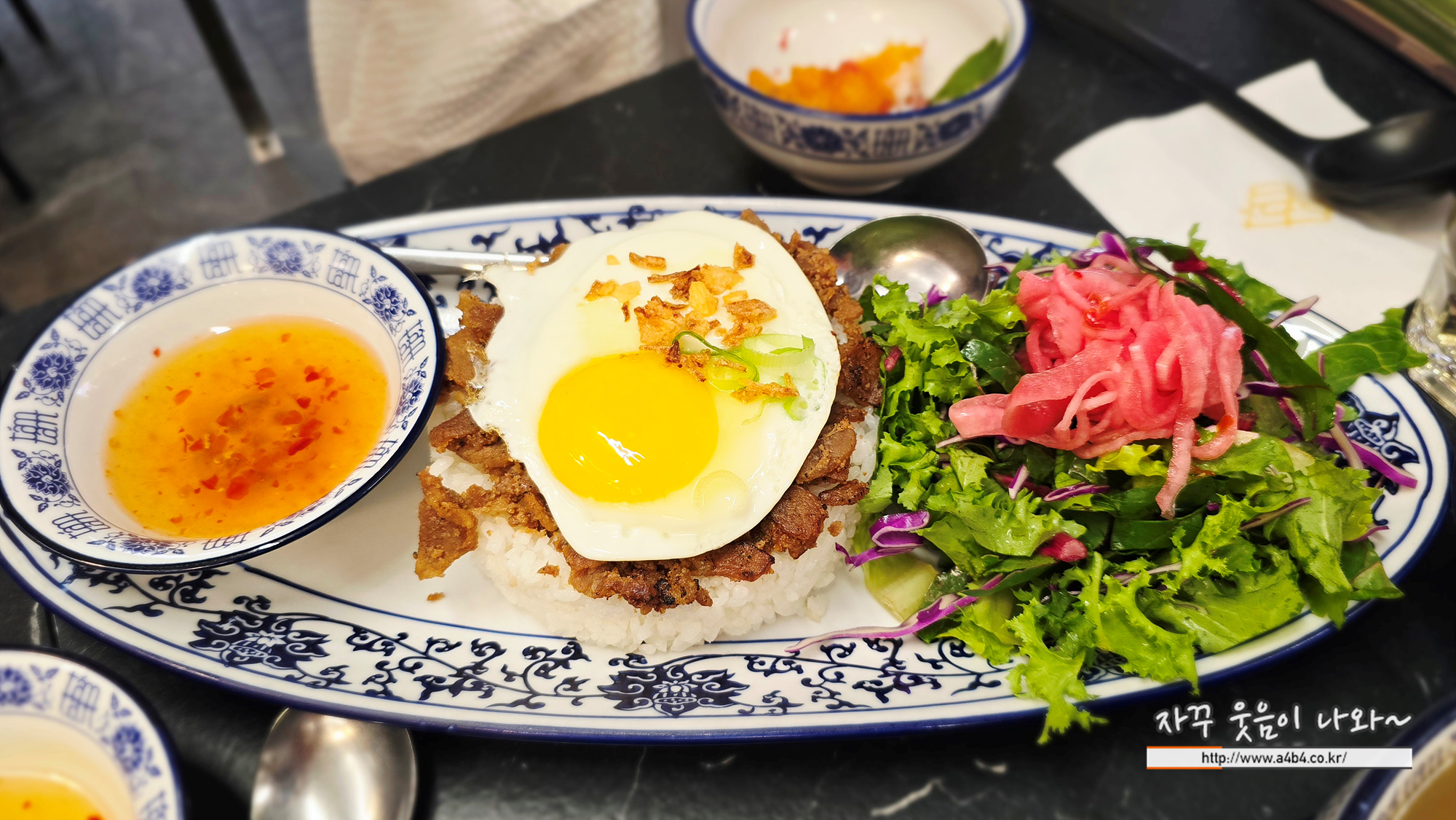 땀땀에서 인기 있는 메뉴 중 하나가 바로 숯불구이 돼지고기 덮밥입니다. 땀땀 음식들이 기본적으로 양이 많고 푸짐하고 국물과 면, 밥이 리필되다 보니, 두 명이 오면 한 명은 베트남 쌀국수를 다른 한 명은 분짜나 덮밥류를 많이 주분합니다.