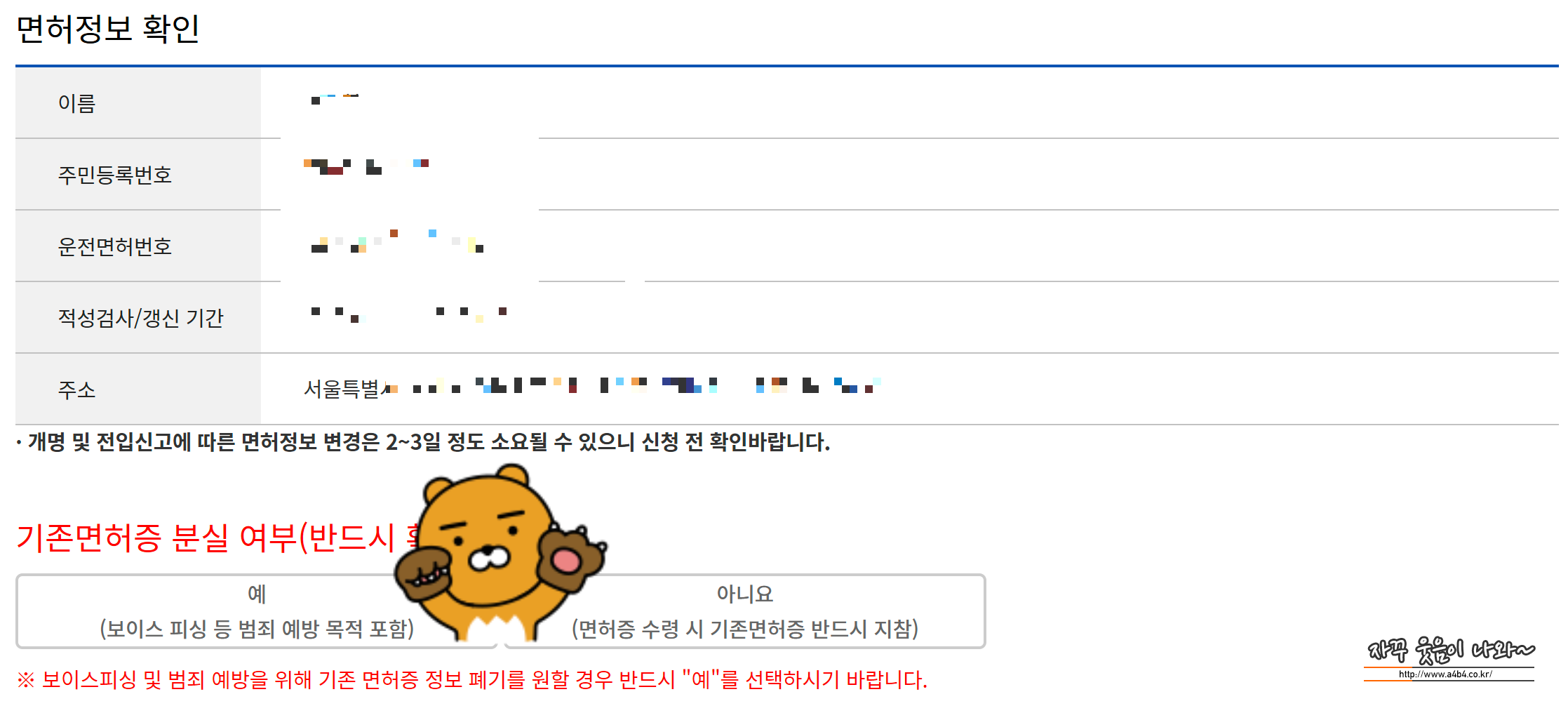 약관동의 후 기존 분실한 운전면허증 면허정보 확인절차가 진행됩니다.