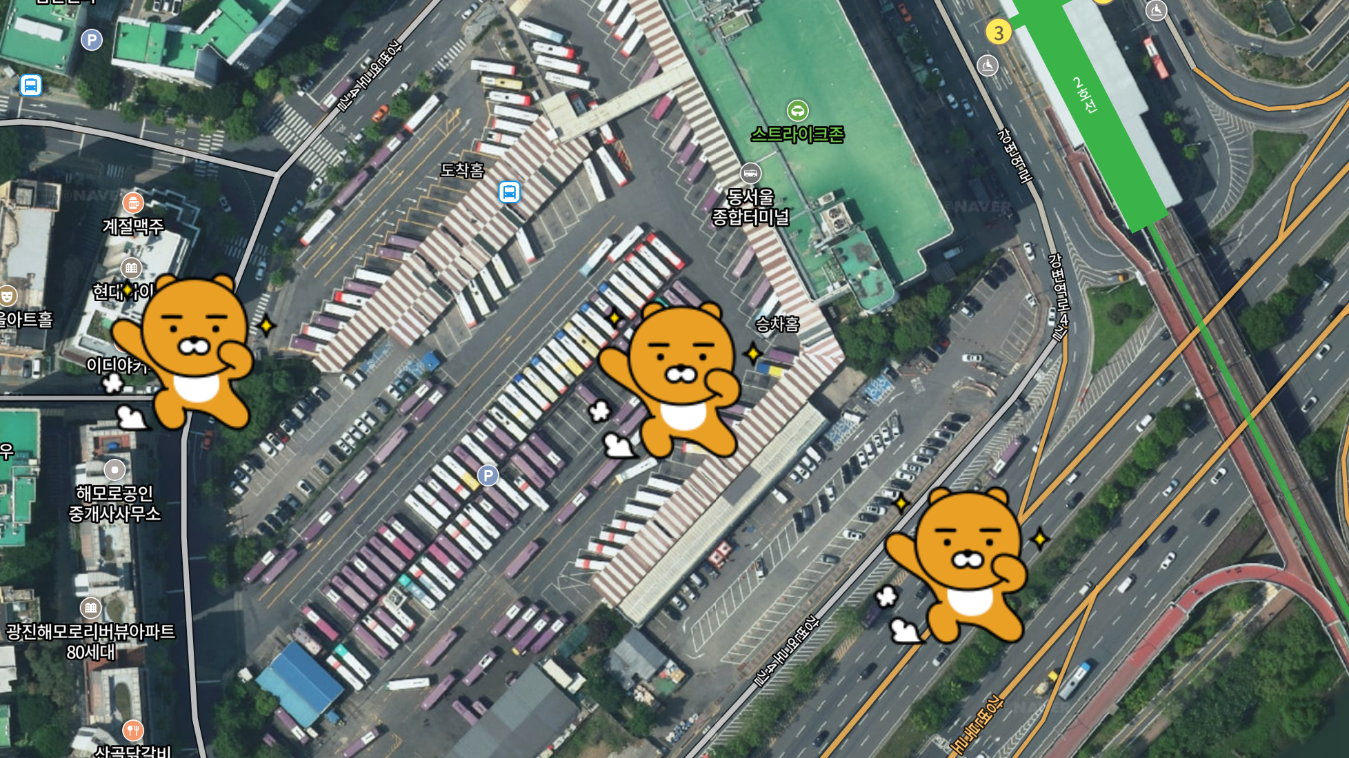 아래 위성지도에서 라이언이 있는 곳이 오늘 소개한 세곳의 동서울버스터미널 일반 주차장입니다.
