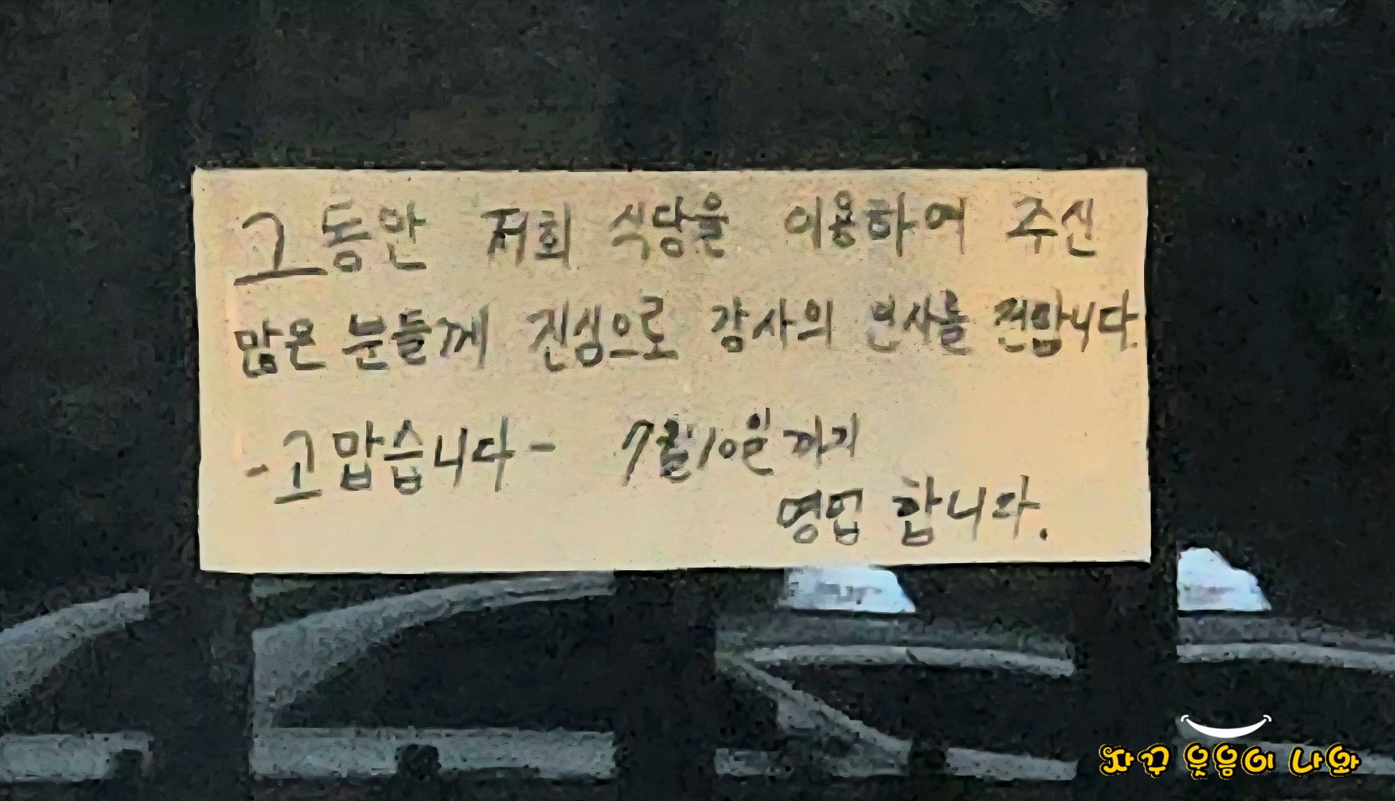 건물 유리창에는 그동안 저희 식당을 이용해 주신 많은 분들에게 감사하다는 말씀과 7월 11일자로 영업종료 한다는 안내가 있네요.