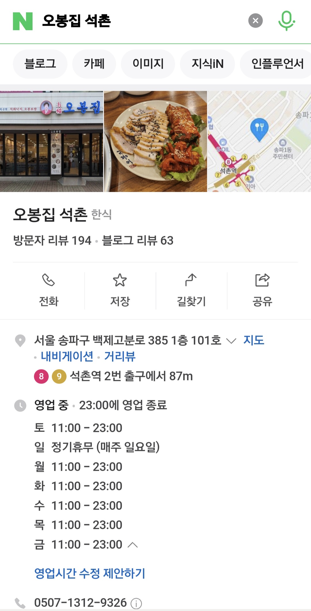 아래와 같이 네이버지도나 다음 지도에서 오봉집 석촌점을 검색하면 현재까지도 영업중으로 안내되고 있습니다.