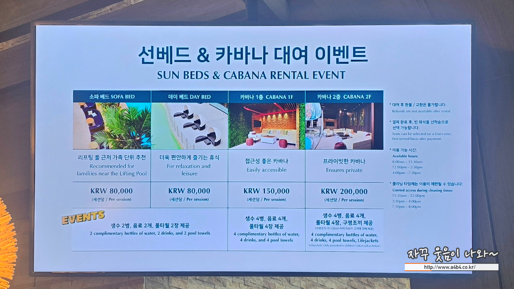 인스파이어 스플래시 베이 선베드나 카바나는 유료 이용이 가능한데요. 가격은 후덜덜합니다.