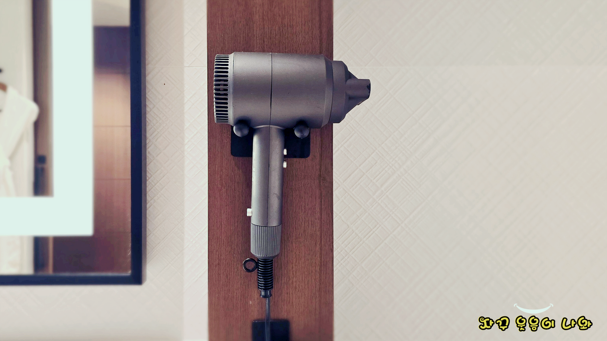 헤어 드라이기 비치되어 있는데, 드라이기 걸이와 전원 콘센트는 반대쪽에 있어서 겁나 사용하기 불편한...