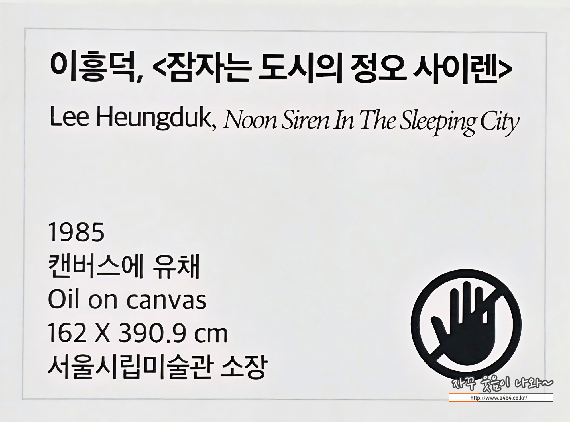 1980년대 서울, 민방공 훈련이 울리던 정오의 모습을 그린 이흥덕 작가의 작품입니다. 작가는 도시의 평범한 일상 속에서 현대인의 불안, 욕망, 그리고 모순을 포착합니다. 도시를 찬미하거나 미화하지 않고, 현실에 존재하는 긴장을 시각화한 이 그림에서, 푸른색으로 뒤덮인 도시 풍경은 얼어붙은 듯한 냉기를 자아냅니다.