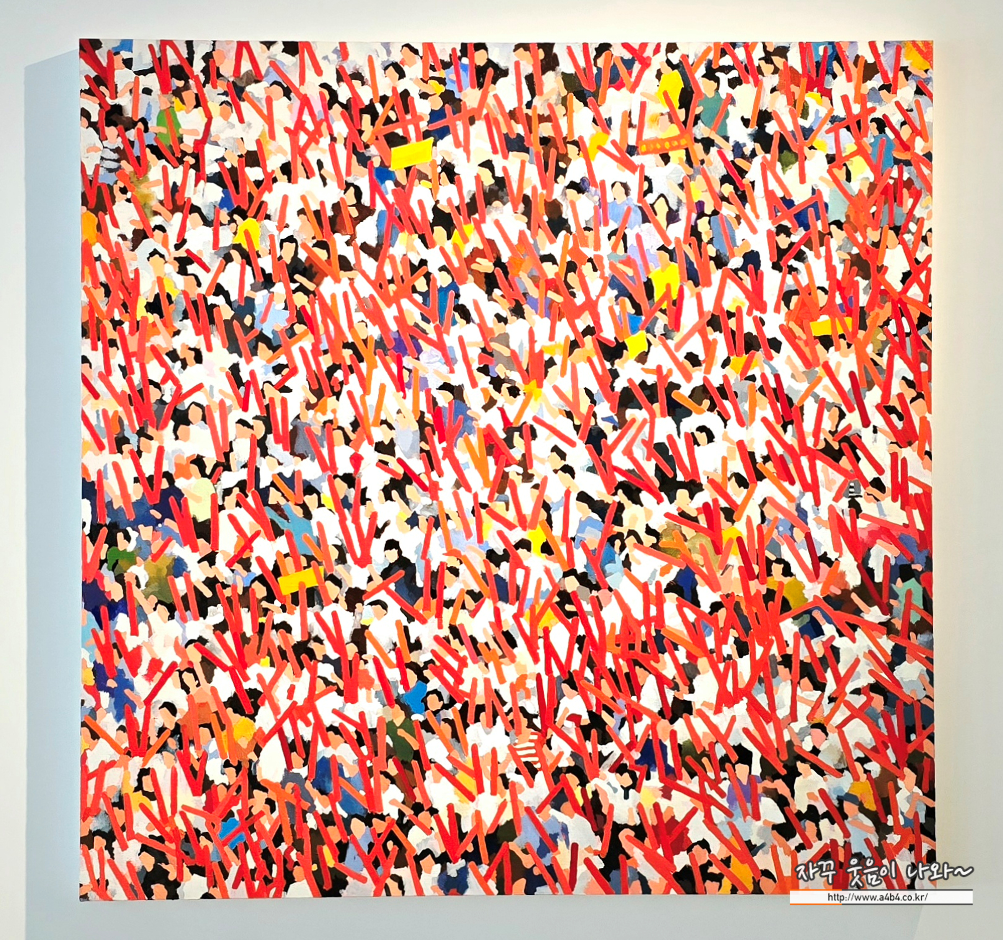 이 열정적인 에너지를 담은 그림은 이상원 작가의 작품입니다. 스포츠 경기장의 열기를 떠올리게 하는 장면 속 사람들은 한곳에 모여 비슷한 감정을 느끼고 행동을 반복합니다. 작가는 이러한 모습에서 패턴을 발견하고, 현대인의 여가와 그 속에 담긴 시대성에 주목했습니다. 이 시대성은 국경·성별·인종을 넘어 전 세계적으로 공감할 수 있다고 봤습니다.