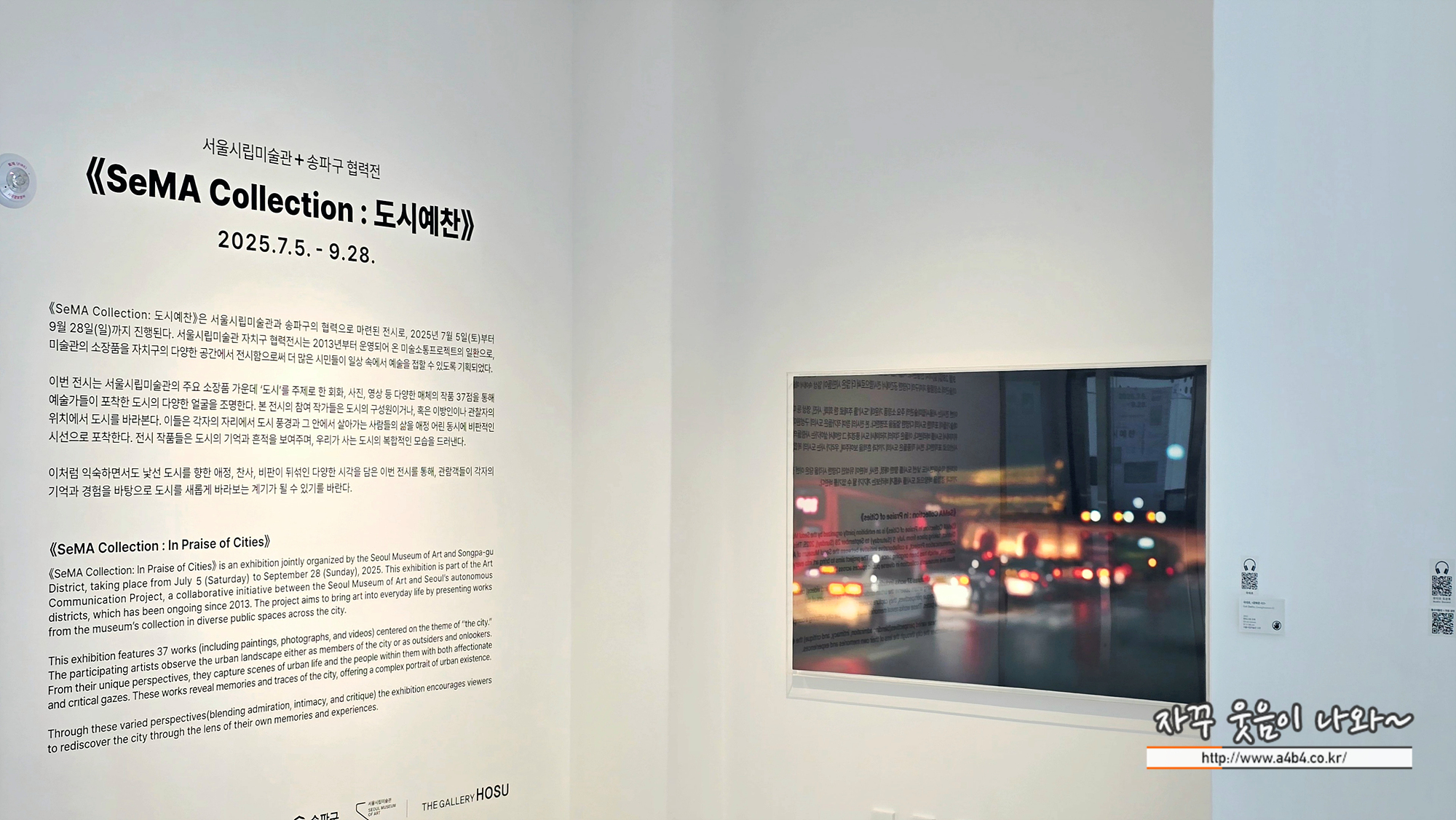 이번 '서울시립미술관 소장품전 ‘SeMA Collection: 도시예찬’ 전시회는 네이버 오디오클립을 통해 무료로 오디오가이드가 제공됩니다. 꼭 이어폰 챙겨 가세요. 또한 주말 포함 매일 11시와 15시 도슨트도 진행됩니다.