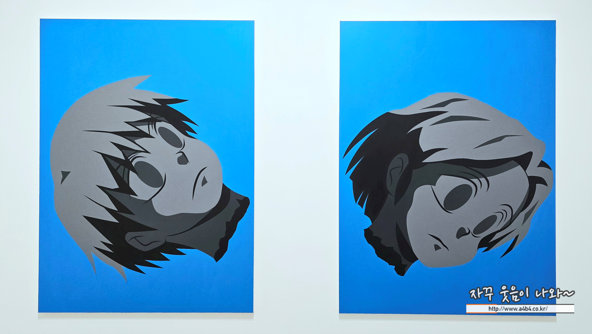 작가의 대표적인 남여 두 아이콘 한 방향은 점점 진해지고, 다른 한 방향은 희미해진다.