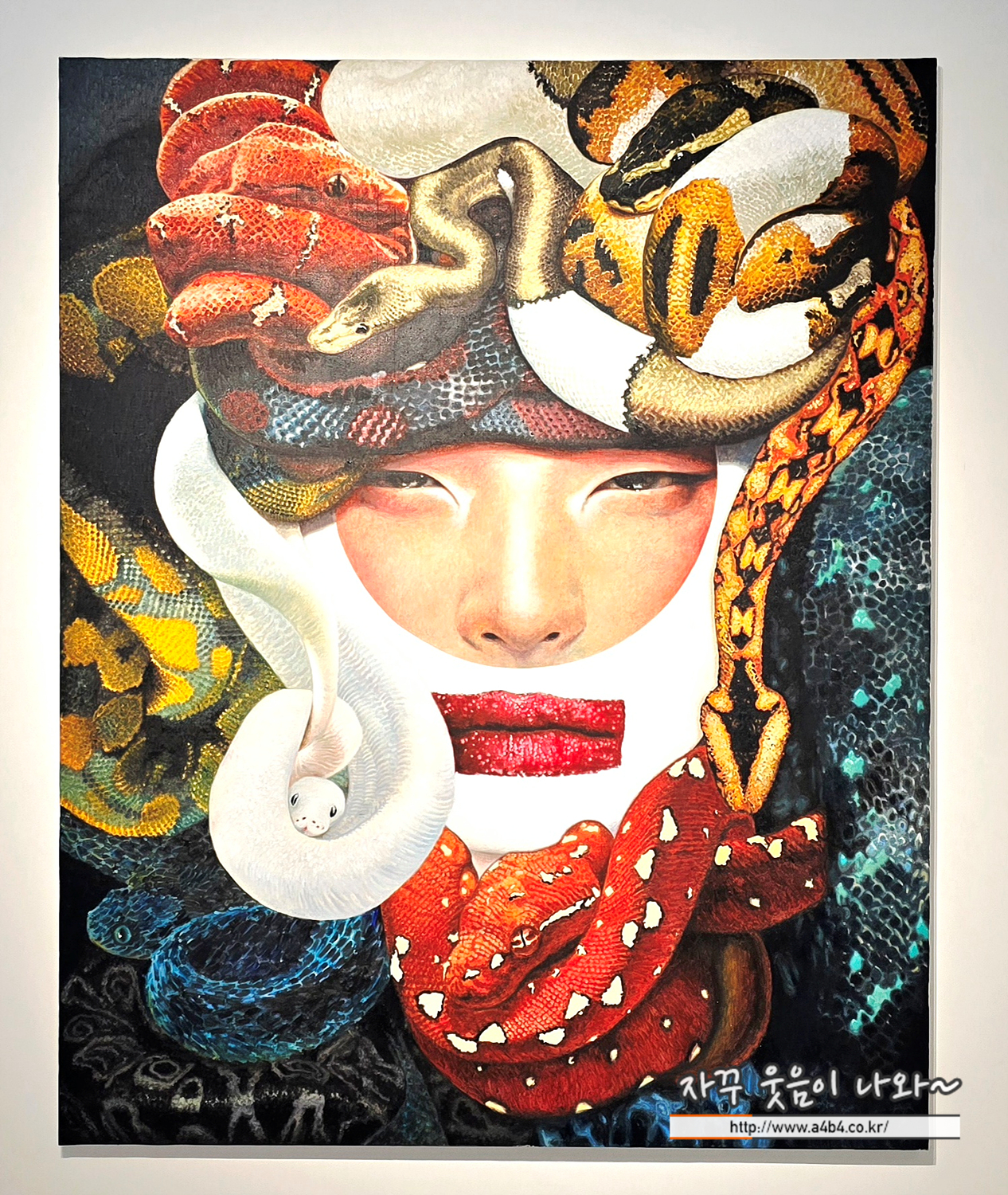 온갖 색의 비늘이 뒤엉켜, 얼굴을 신성한 가면처럼 두른다. 하얀 뱀의 미소와 붉은 입술이 생과 죽음의 경계에서 운명을 예언하듯 빛난다.