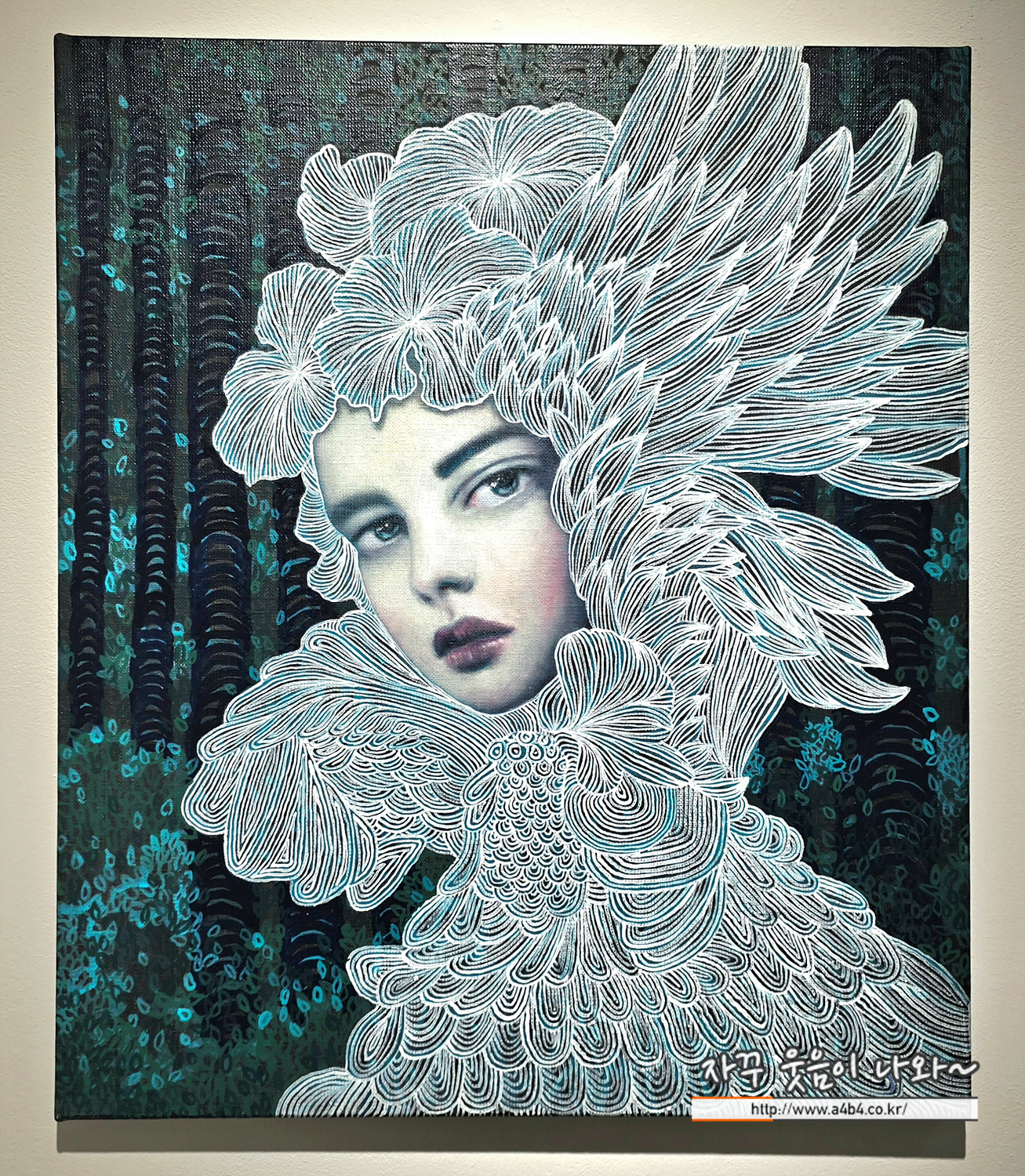 왕관처럼 둘러진 날개, 그 안에서 눈은 고요히 빛난다. 하늘과 바다와 숲이 합쳐져, 한 여인의 영혼을 감싸고, 그 입술은 아직 바람을 기다린다.