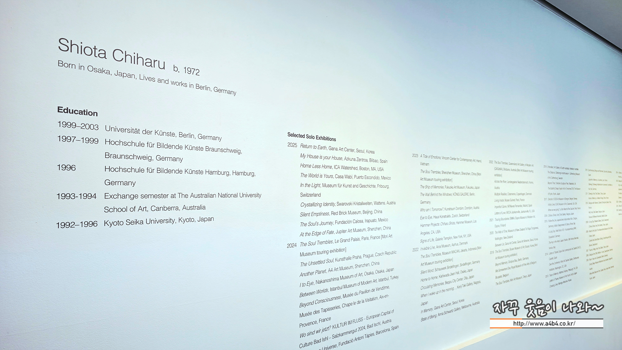 이번 가나아트센터 시오타 치하루 개인전 'Return to Earth' 전시회는 Space1~3 총 3개 공간에서 전시회가 열리고 있으며 약 90분 내외의 최소 관람시간이 필요합니다.