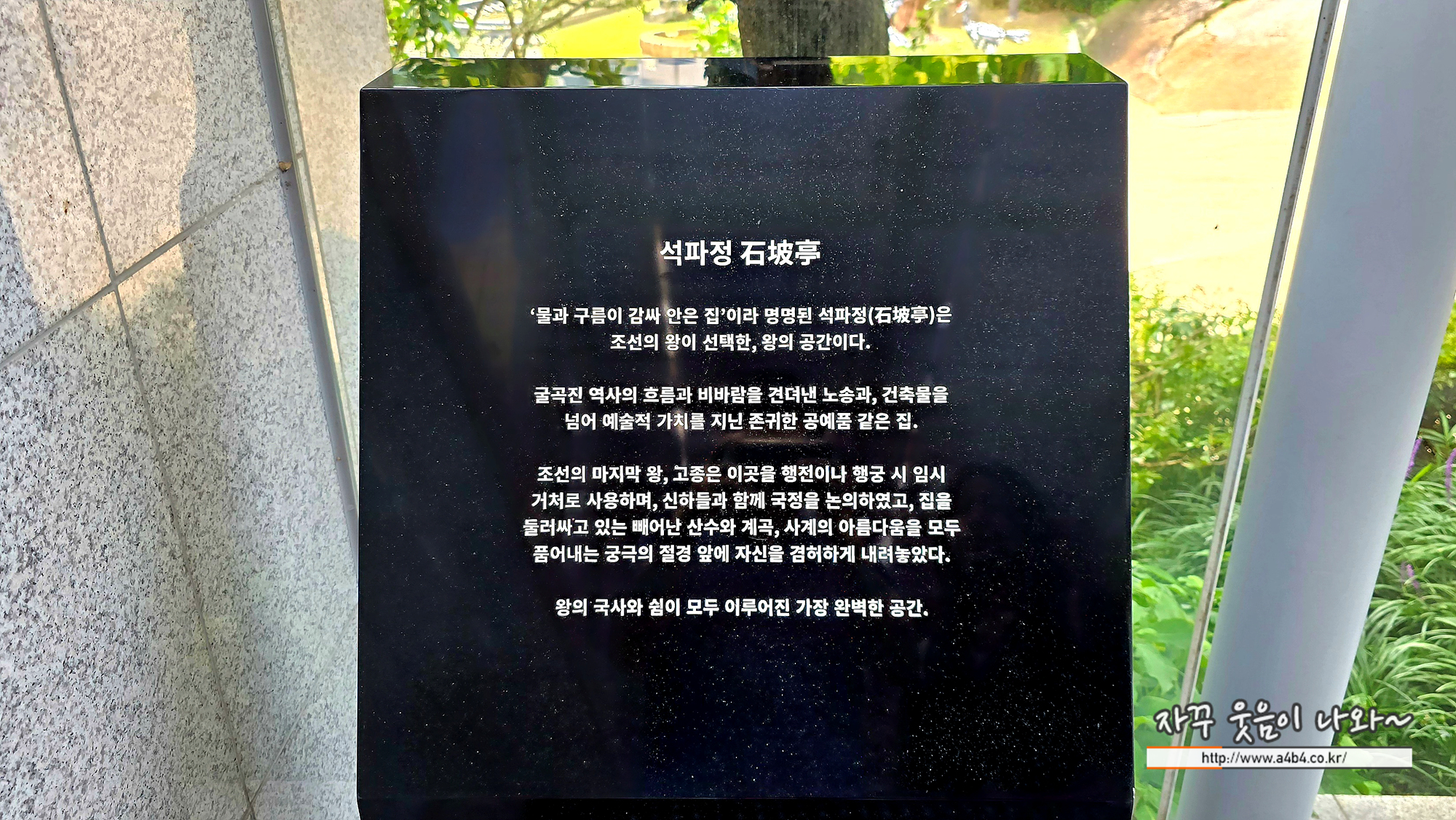 참고로 우리가 부르는 석파정의 석파는 흥선대원군의 호 석파(石坡)에서 따온 것이라고 합니다.
