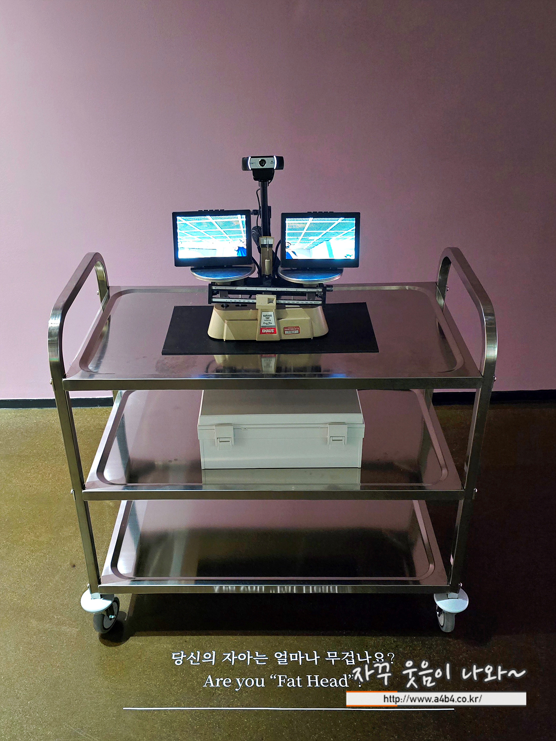 영어로 과장된 자아를 의미합니다. 카메라 앞에 두 명의 사람이 서면 기기에 연결된 장치에 의해 자아가 비대한 사람의 방향으로 저울이 기울어집니다. 타인의 평가를 궁금해하는 사람들은 기계가 이를 정확히 밝혀줄 것이라 생각하지만, 이 작품은 기계의 평가에 따라 자존감을 정립하는 것의 덧없음을 보여주며 진정한 자아감은 어디로부터 출발하는지 우리에게 묻습니다.