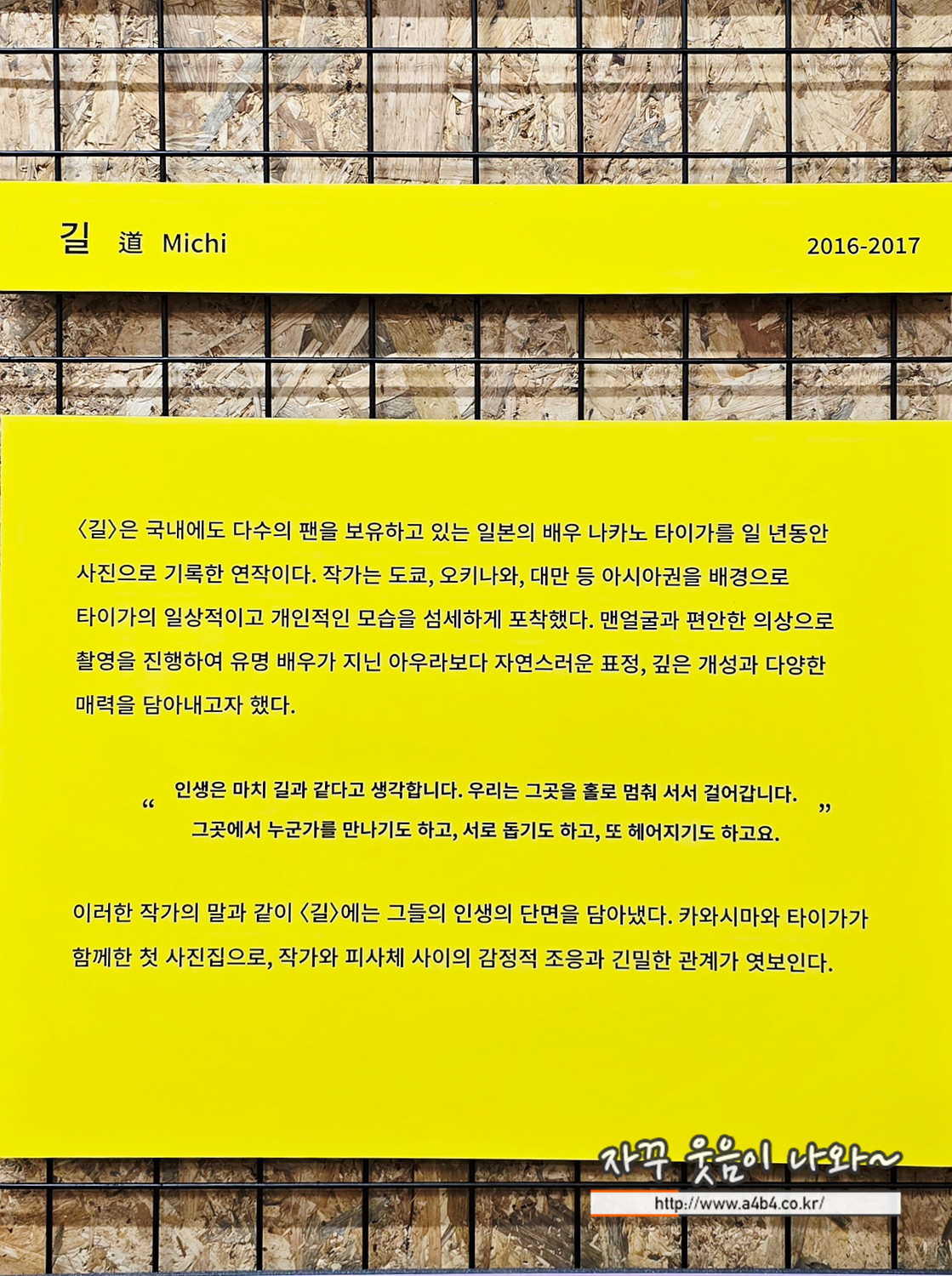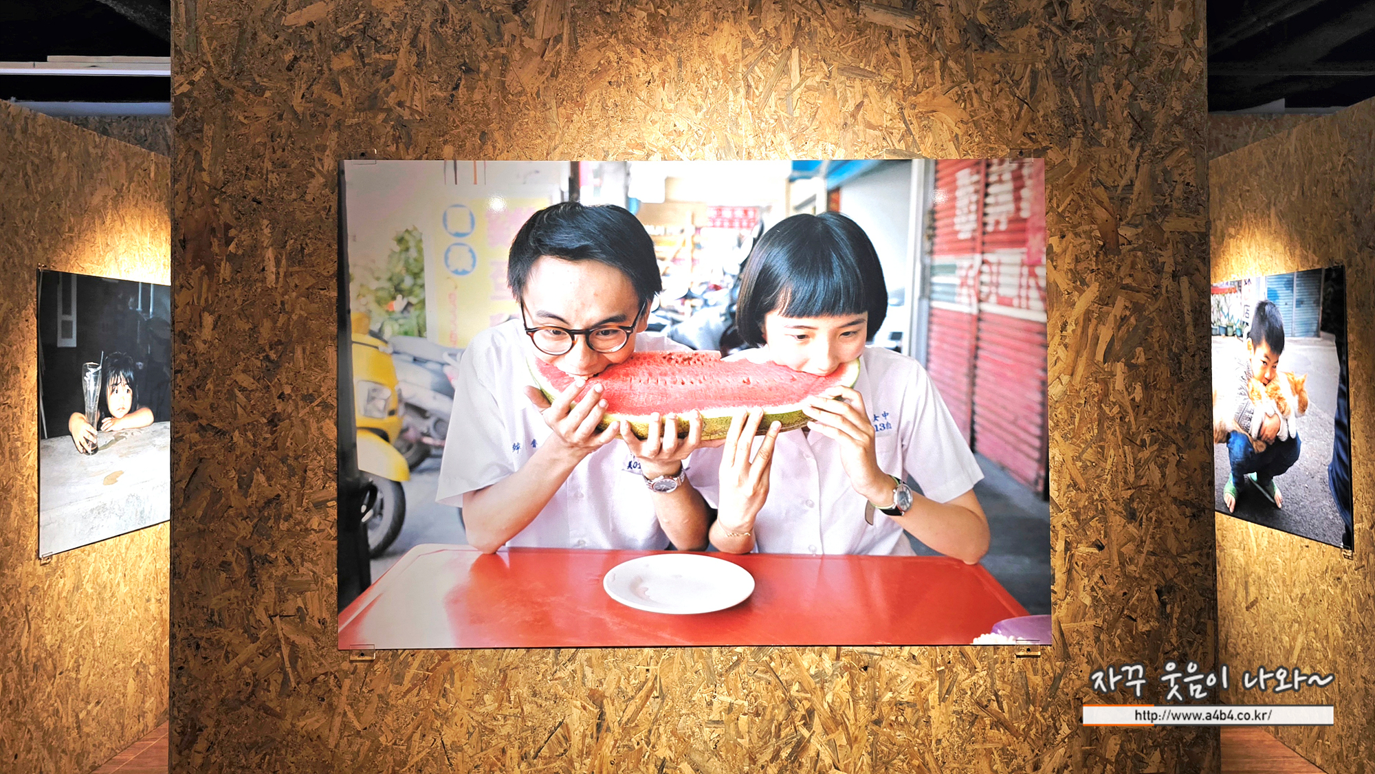 남녀가 마치 서류를 바라보며 찍어주는 듯한 장면의 비티가 재미있게 느껴지는 공간입니다. 일본의 남자 배우 나카노 타이가와 대만의 여자 배우 야옥 아이닝이 함께한 작업인데요. 사진가와 피사체 나와 너 사이에 위치한 카메라를 통해 두 사람을 둘러싼 공기 관계의 마음이 함께 사진에 담긴 공간입니다.