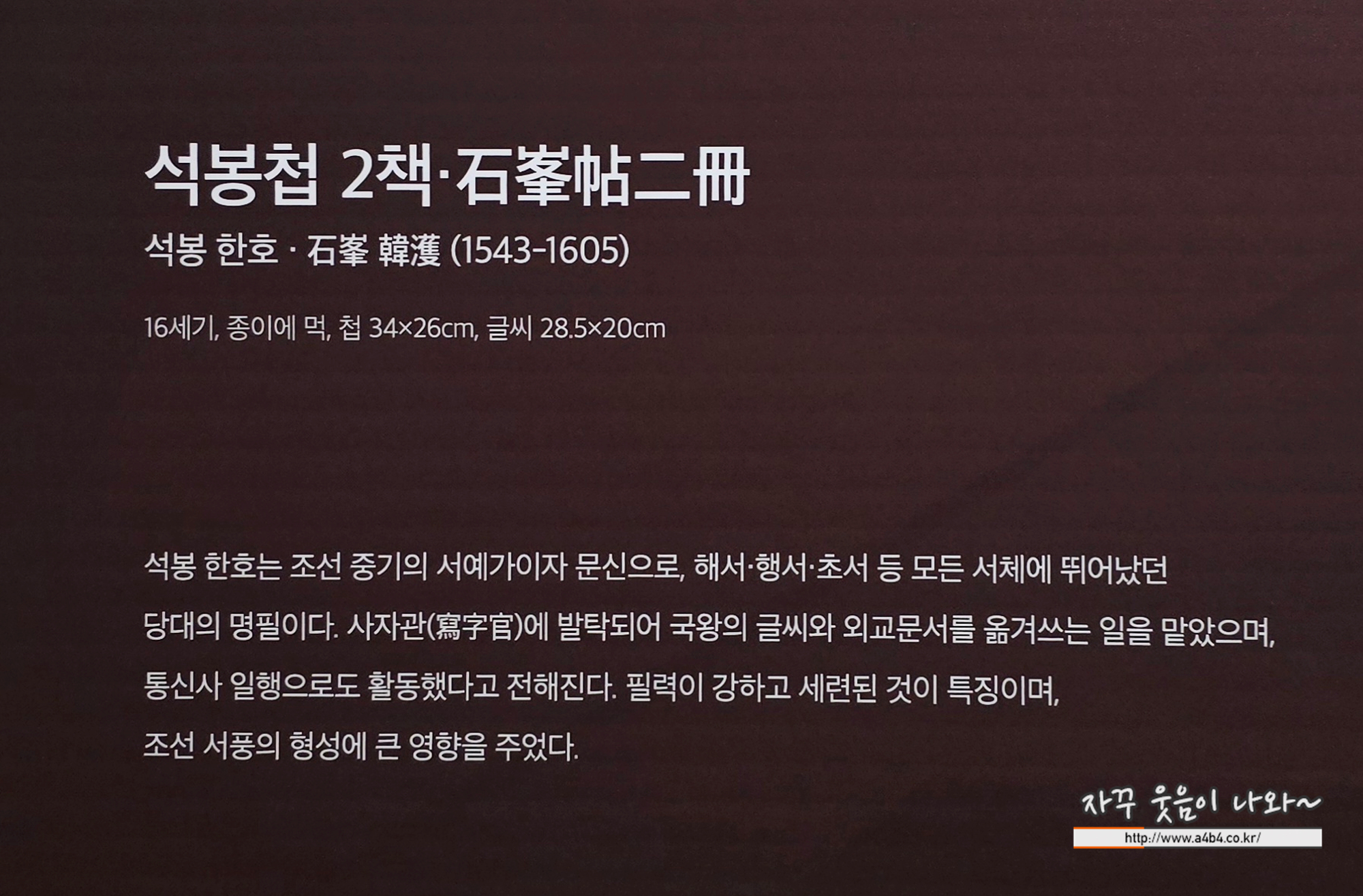 조선시대 서화와 불화 51점이 전시되고 있으며, 우리에게도 너무나 잘 알려진 한석봉, 연담 김명국, 궤은 이기룡(1600-?), 연담 김명국(1600-1662 이후), 설봉 김의신(1603-1663 이후), 단원 김홍도(1745-?), 혜산 유숙(1827-1873) 등의 작품을 만나볼 수 있습니다. 관람 시간은 1시간 내외...