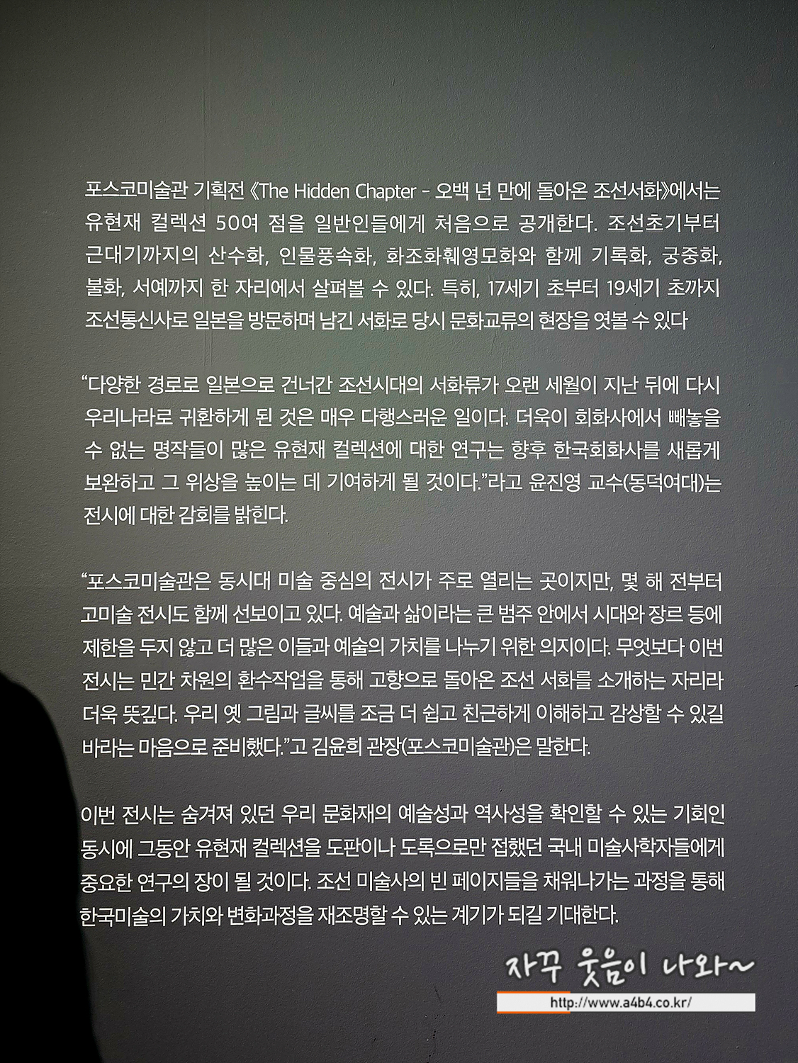 이번 삼성동 포스코미술관 전시회 The Hidden Chapter - 오백 년 만에 돌아온 조선서화 특별전은 11월 9일까지 전시에정입니다.