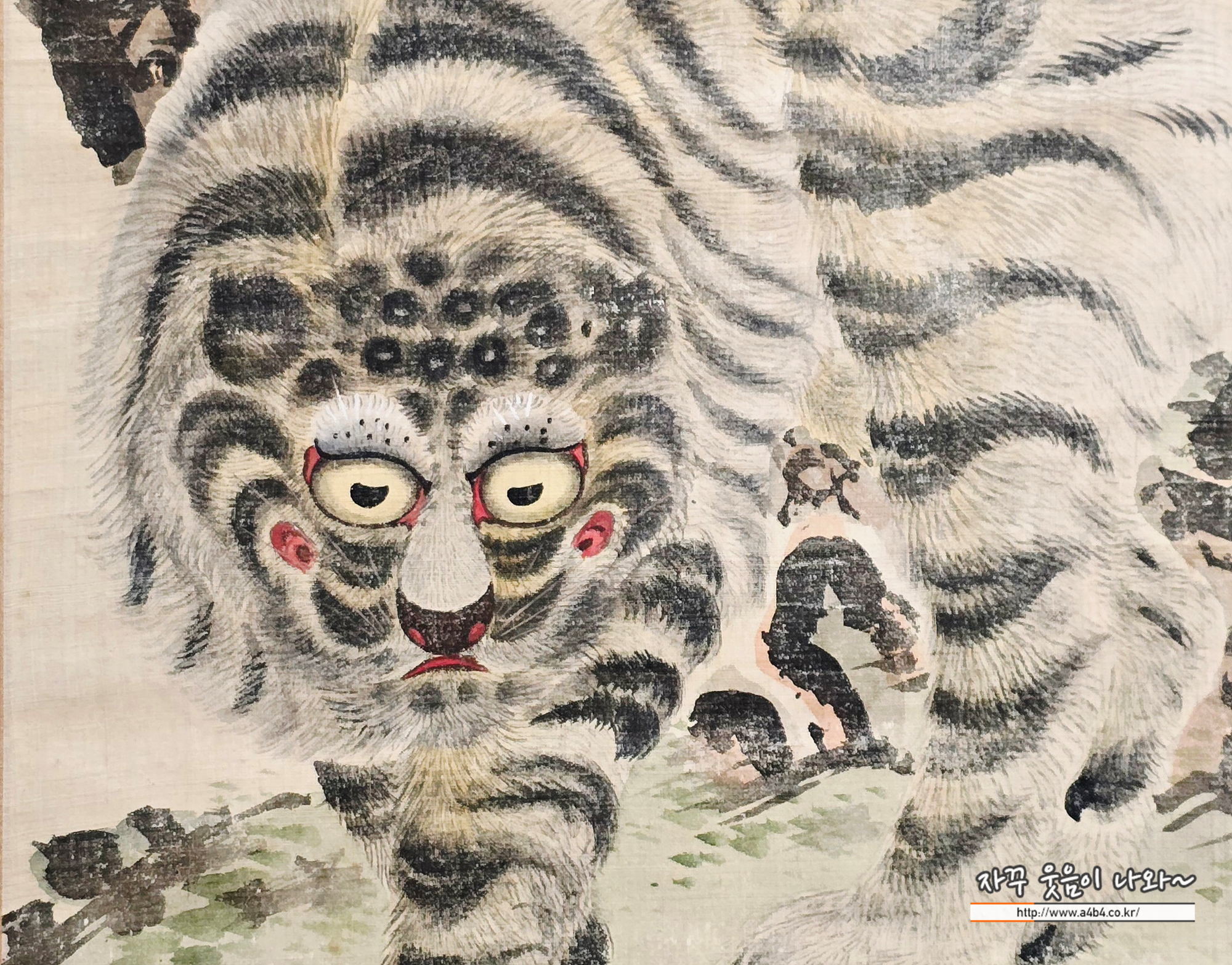 호랑이와 용이 한 쌍으로 등장한다. 호랑이는 등과 다리에 이르기까지 풍성한 털 묘사와 발톱이 묘사되어 존재감을 드러낸다. 눈은 크고 둥글며 전방을 응시하고 있어 경계심과 위압감을 함께 나타낸다. 화면 상단에는 소나무가 자리한다.