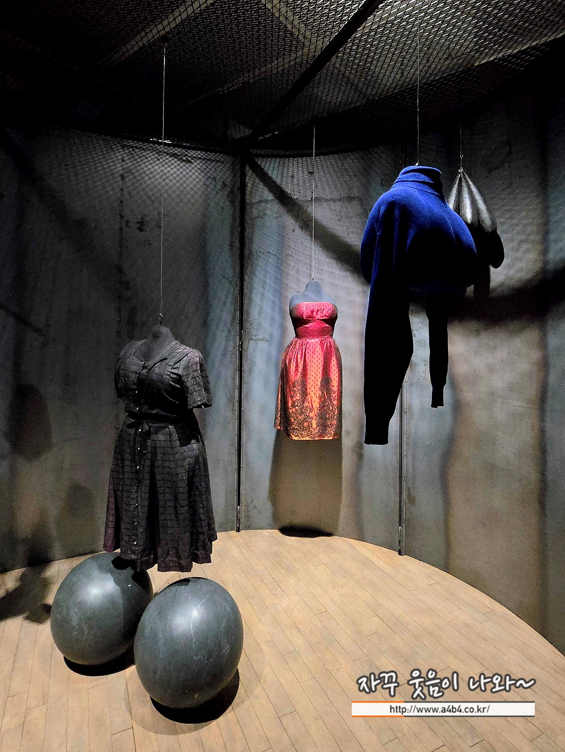 한 쌍의 구는 가슴을 연상시키기도 하고 위에 걸린 드레스와 시각적으로 연결되며 남근적인 형상을 만들어 내기도 합니다.