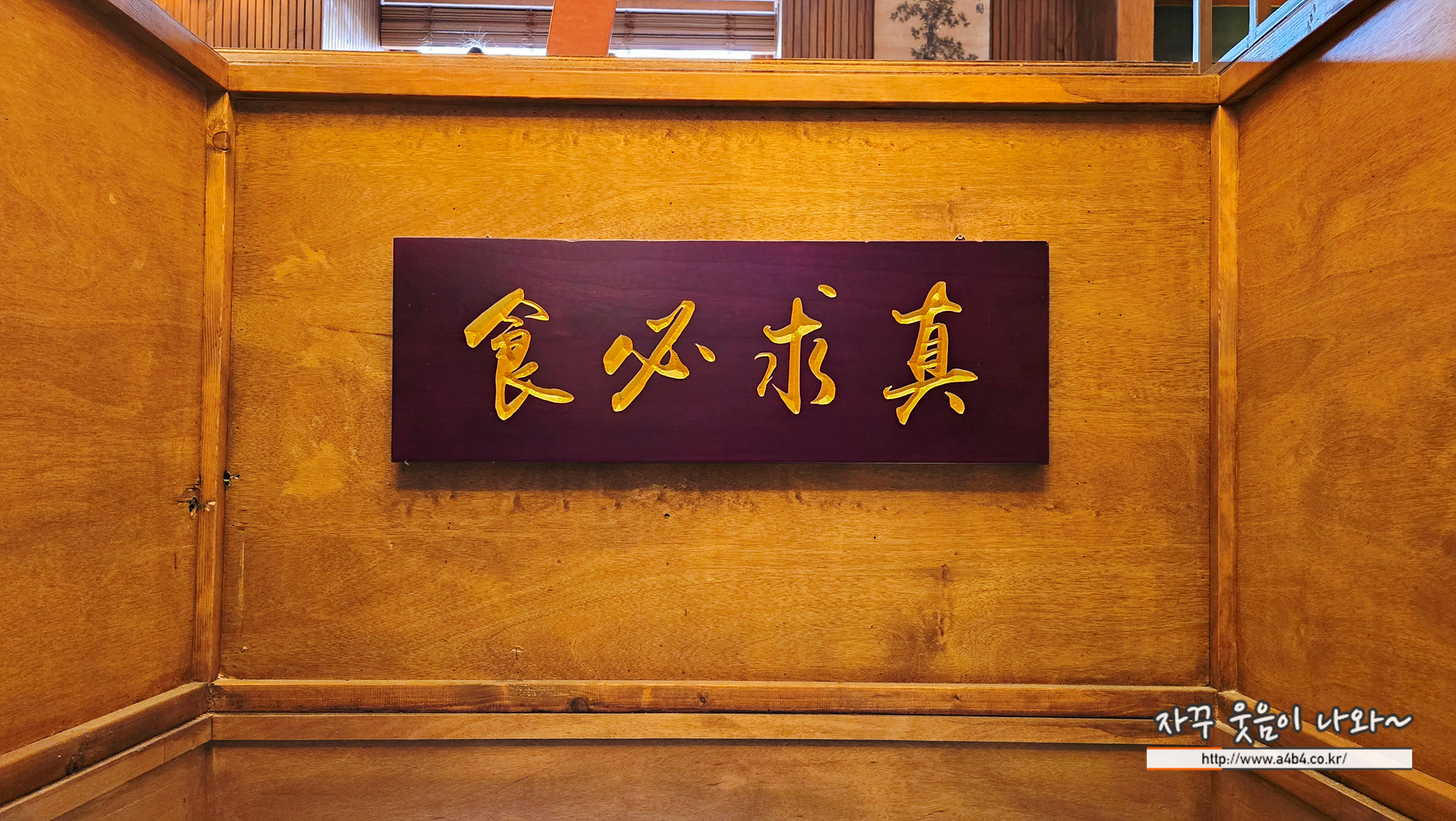 "먹는 데 반드시 진실(참됨)을 구한다"라는 뜻으로, 음식을 대할 때 진솔하고 정직하게 임해야 한다는 의미를 담고 있습니다. 주로 음식점, 식당, 혹은 음식 철학을 강조하는 장소에서 볼 수 있는 문구입니다.