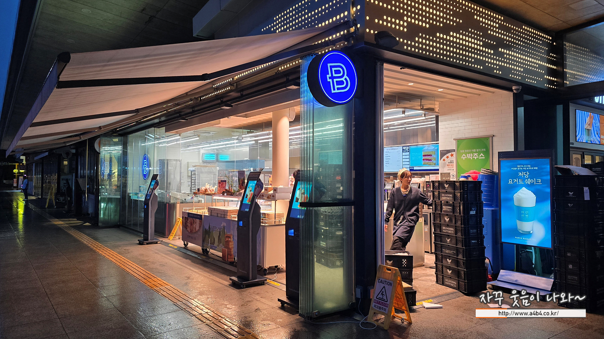 파리바케트는 아직 영업준비중 빵은 막 나오기 시작해서 아직 매대에 올라가지 못하고, 빵 박스들이 들어오는 상황
