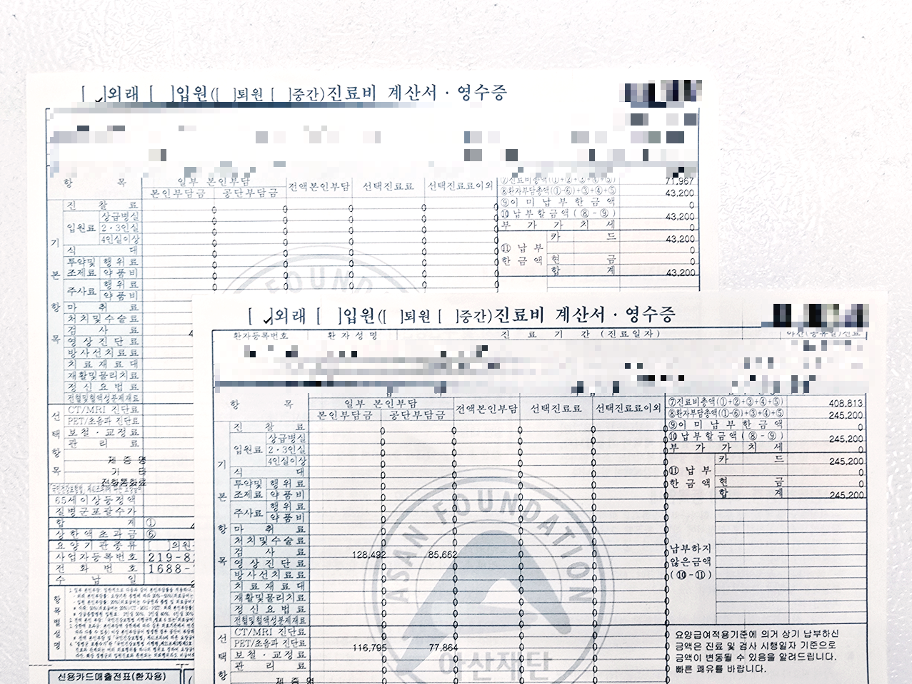 갑상선 세침검사 비용 확인하니 두 장의 영수증이 있네요. 본인부담금 기준으로 43,200원 + 245,200원이 나왔습니다.