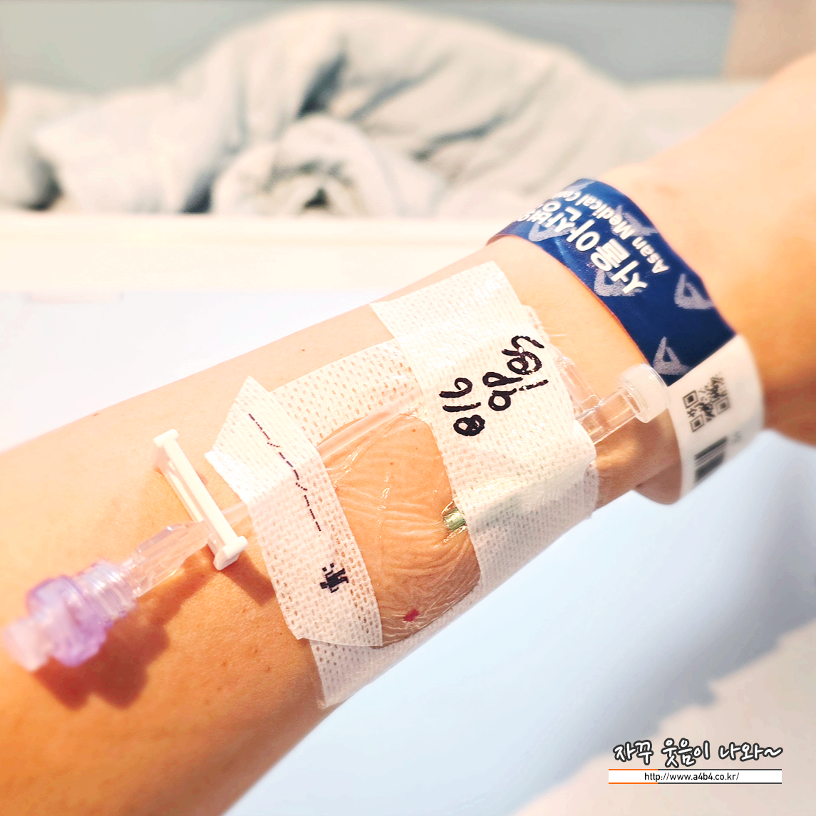입원 후 샤워는 저녁식사 전까지 가능합니다. 저는 입원 저녁 잠자기 전에 샤워하고 자려고 했는데, 저녁에 팔에 이렇게 링거 관을 세팅해 주시네요. 낮에 땀 많이 흘렸는데, 샤워는 포기!