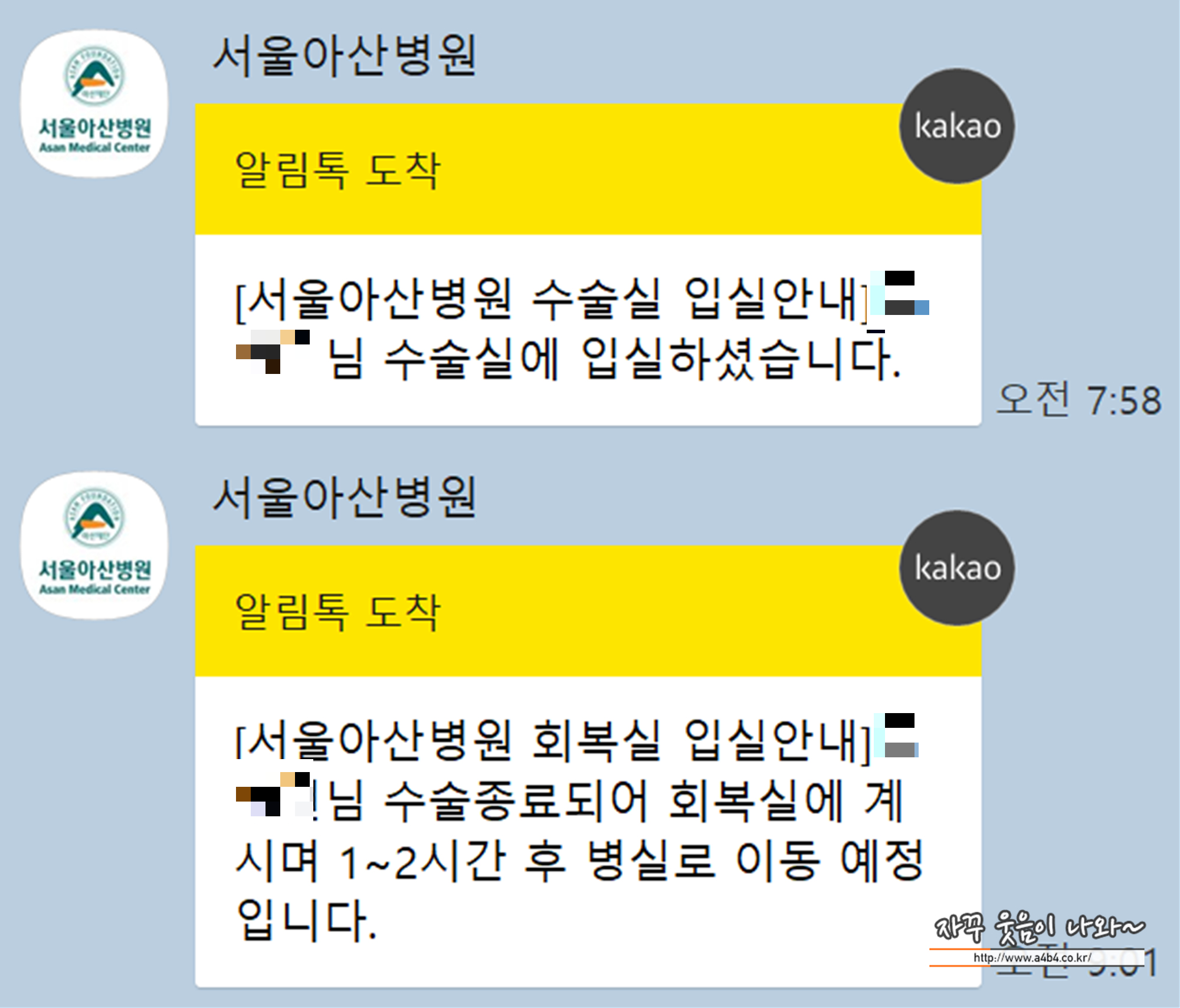 그리고 한 시간 정도 회복실에 더 누워 있다가 병실로 이동합니다.
