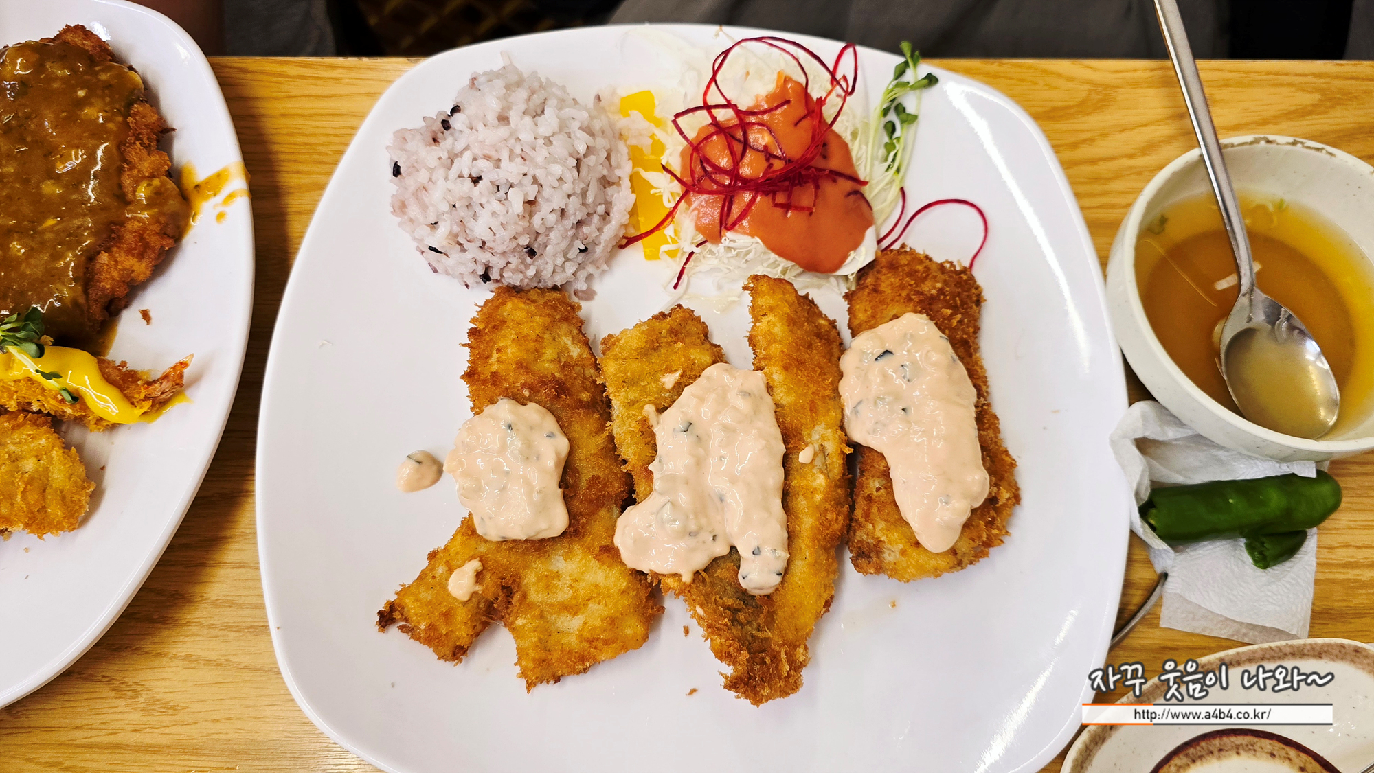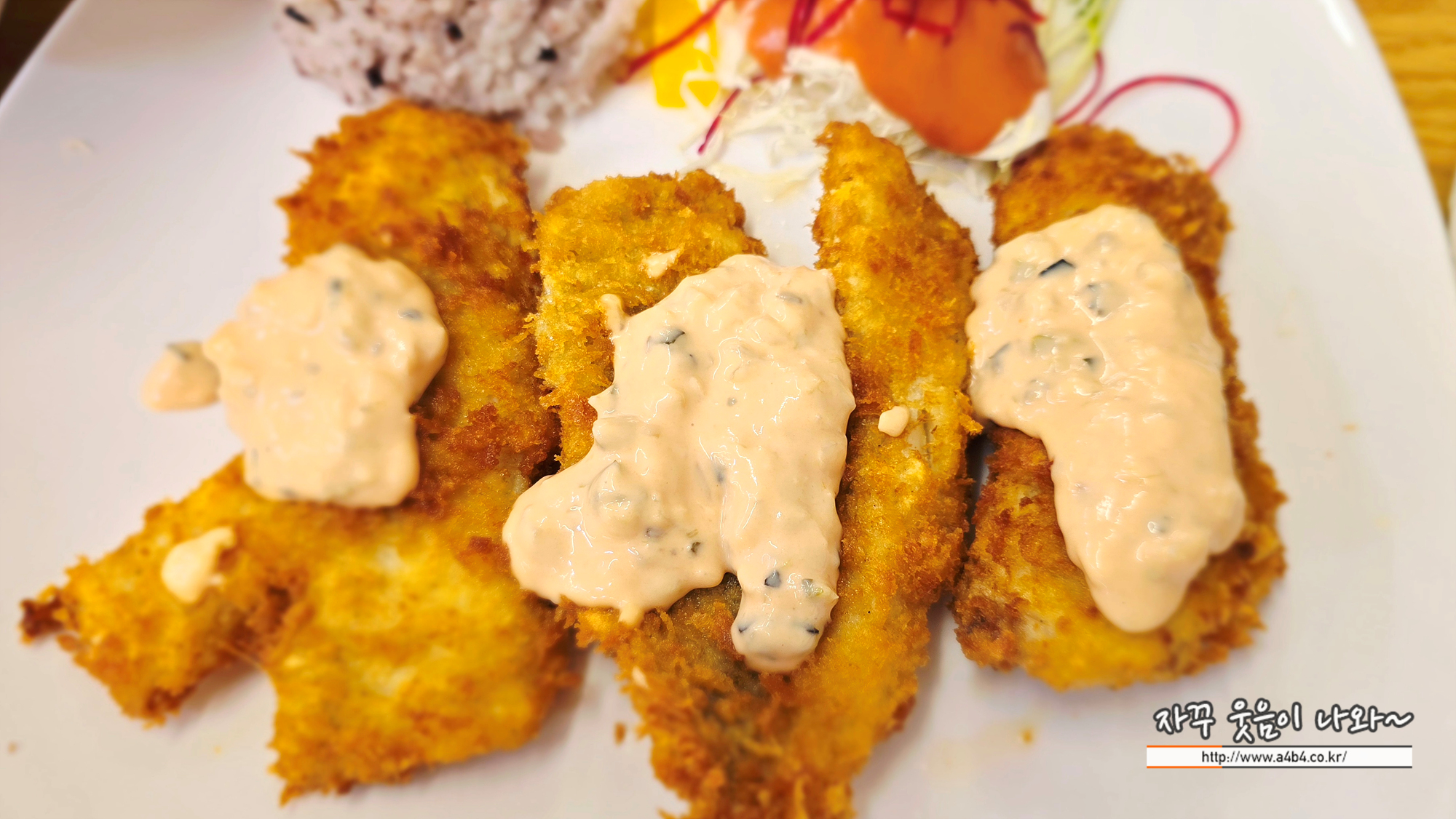 생선까스 4조각 나오고요. 밥과 샐러드 국은 위에서 소개한 돈까스와 동일합니다.