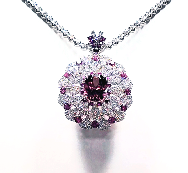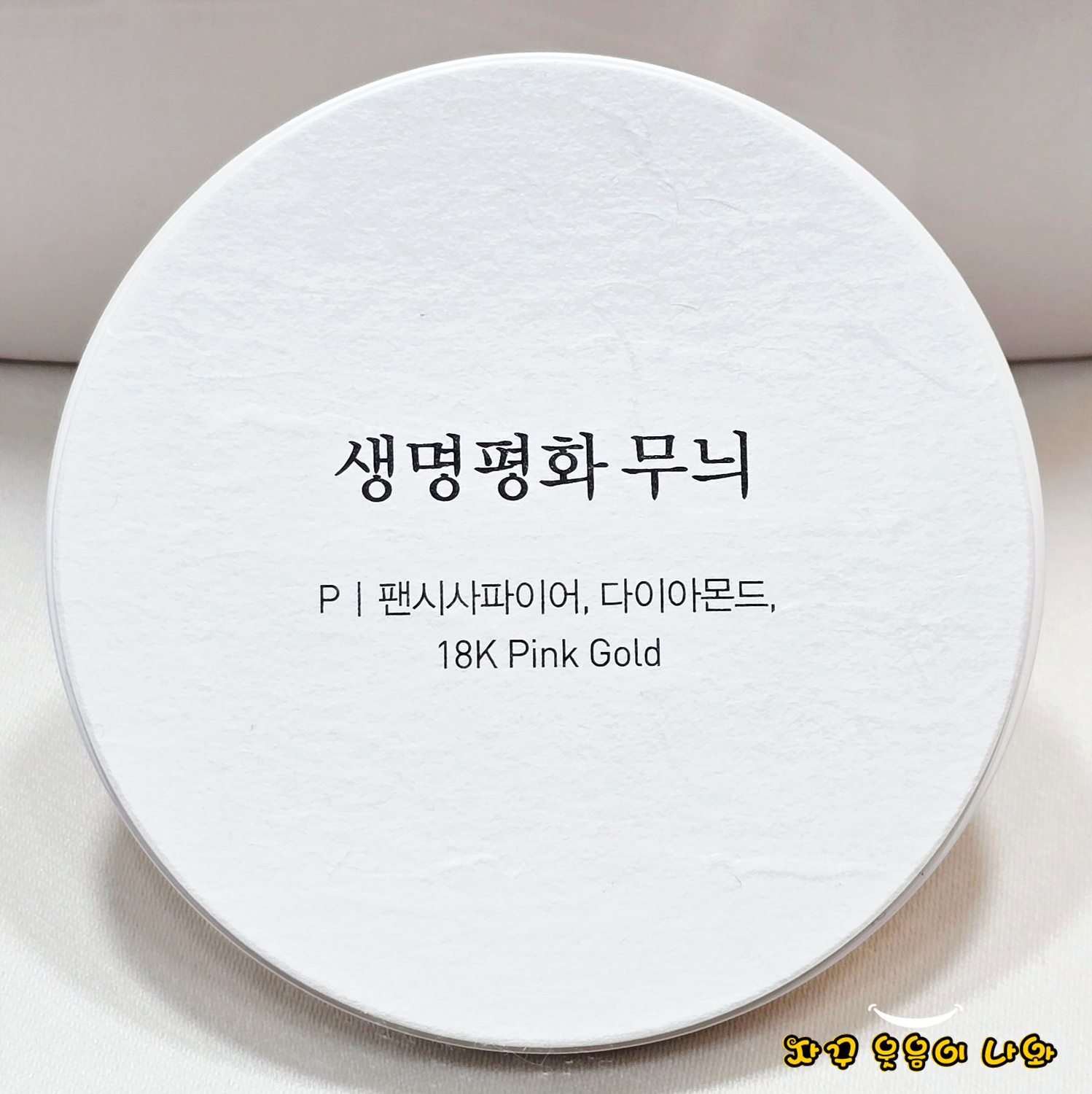'생명평화 무늬'는 인간 중심을 넘어 자연과 공존하는 생명 중심의 가치를 표현하며, 그 철학은 주얼리로도 확장됩니다. 18K 핑크골드 펜던트는 외곽에 팬시사파이어를 세팅해 다채로움을 더하고, 중심 무늬에는 다이아몬드를 세공해 입체감을 완성했습니다. 이 작품은 단순한 장식을 넘어, 생명과 평화의 철학을 지닌 상징적 주얼리로 완성되었습니다.
