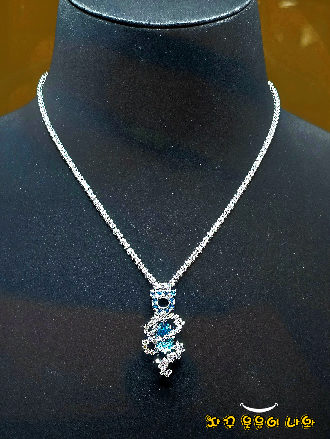 ‘ㅎ’을 유닛으로 삼아 블루 사파이어의 짙은 파랑이 옅은 파랑으로 부드럽게 그라데이션되며, 중앙의 이슬 모양 탄자나이트는 날개 안상수와 골든듀의 만남을 상징합니다.