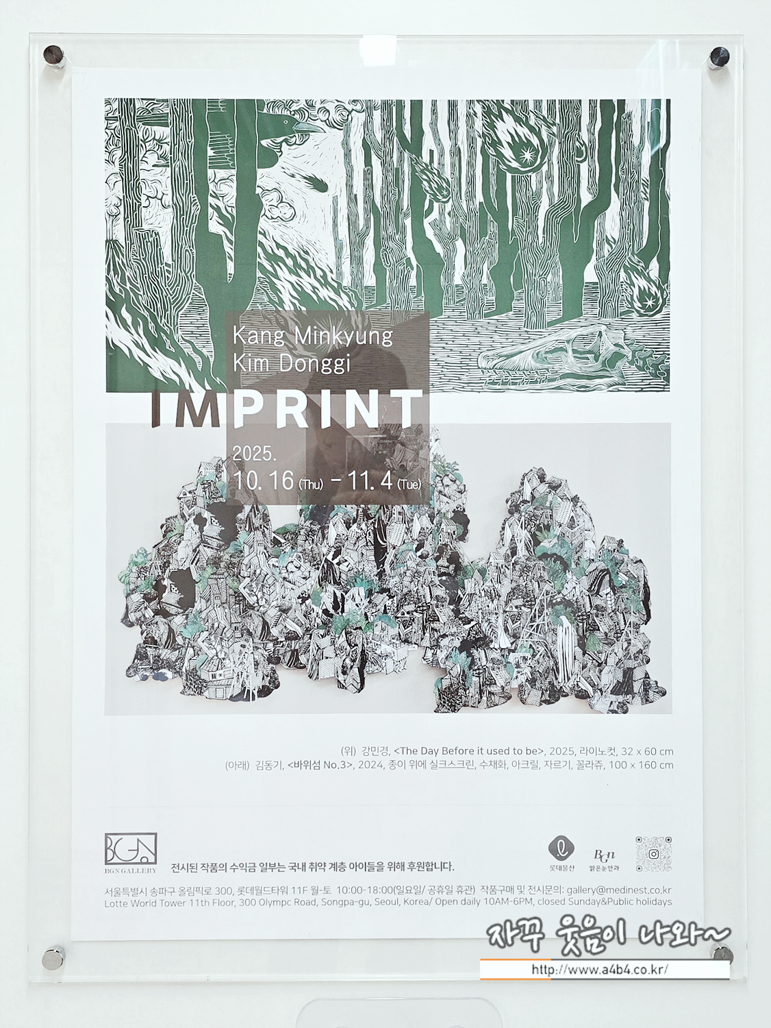 이번 전시회 강민경ㆍ김동기, 판화 기획전 'IMPRINT'는 다음달인 11월 4일까지 잠실 롯데월드타워 11층 BGN갤러리에서 전시될 예정입니다.
