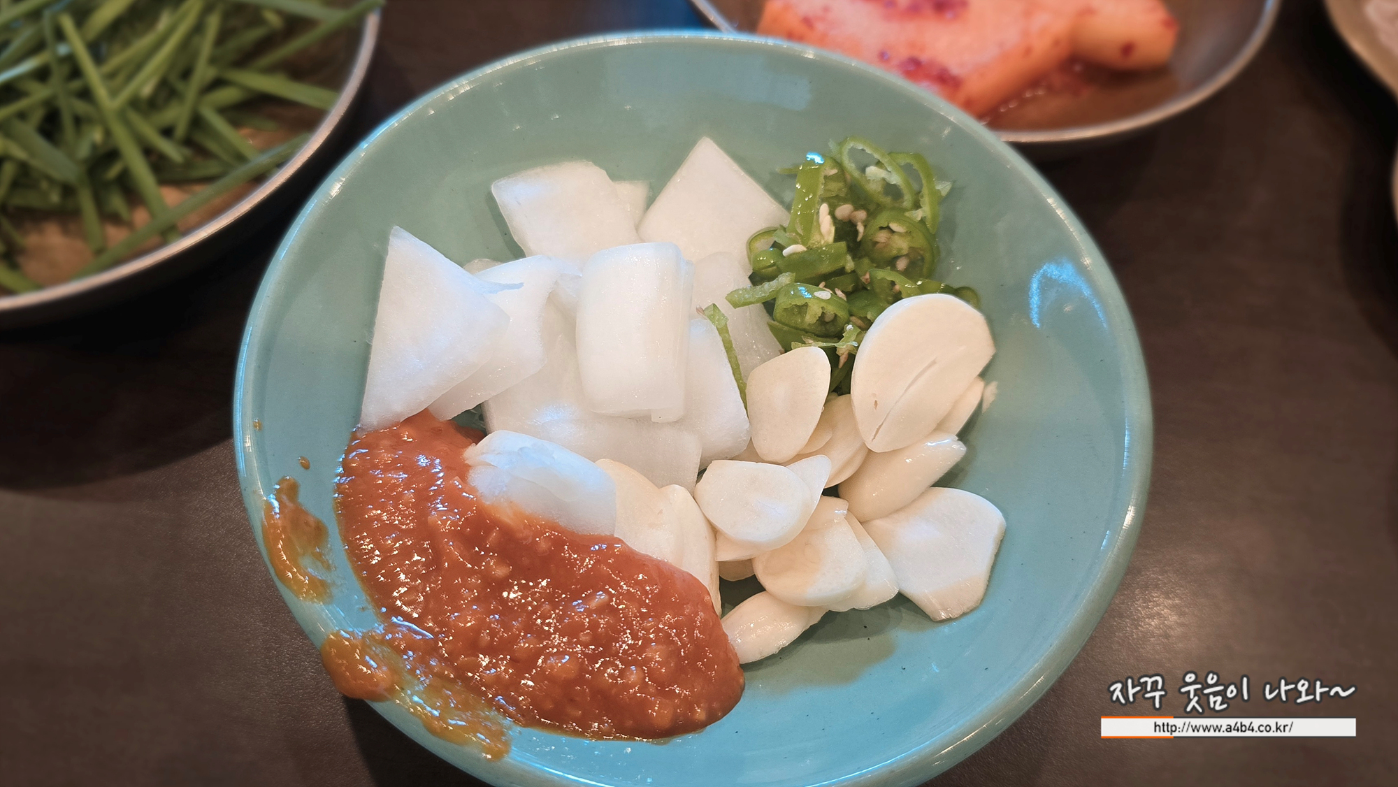 기본 반찬은 무나물과 석박지, 부추와 소스가 세팅되고요. 추가 리필은 셀프입니다. 또한 셀프코너에는 마늘 슬라이스와 양파. 청양고추 등이 추가로 세팅되어 있습니다.