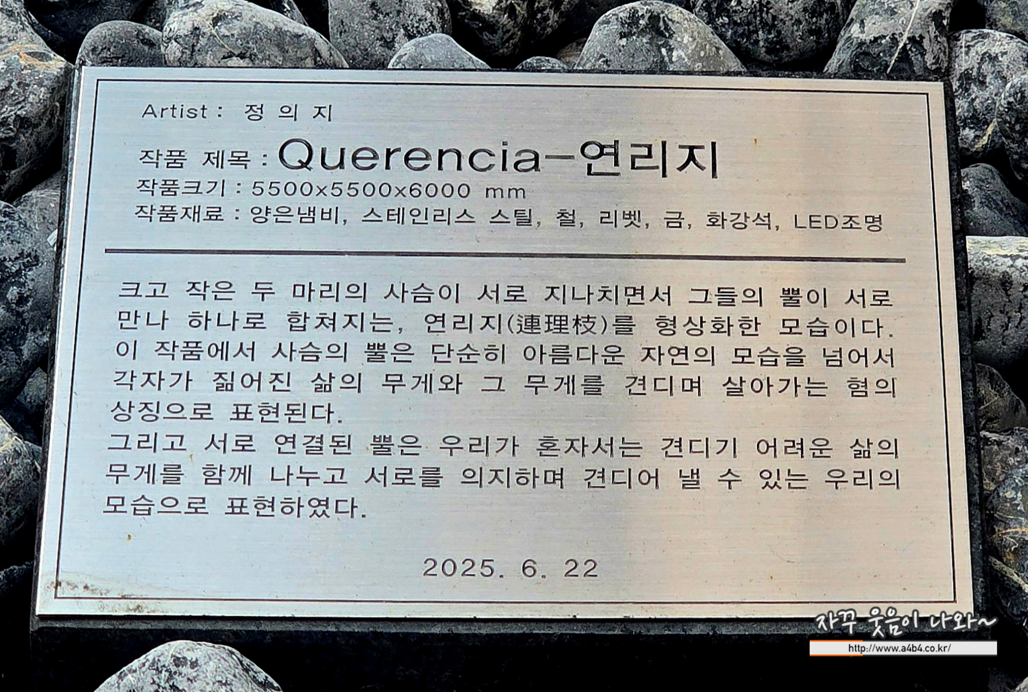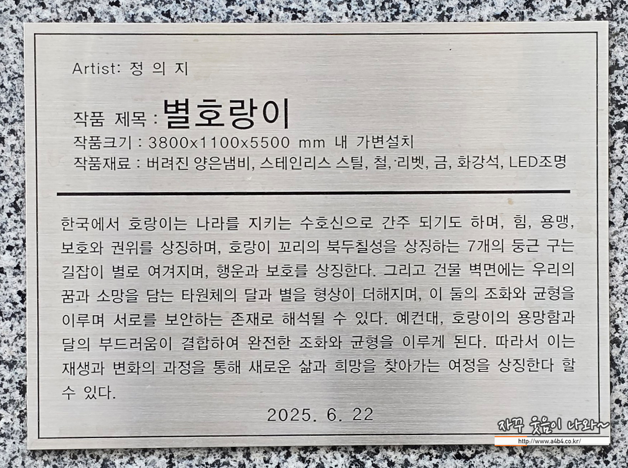 정의지 작가 별호랑이 연리지 작품을 만나볼 수 있는 곳은 서초동 남부터미널 근처 지젤라이피그라피 서초 오피스텔 공개공지에 전시되어 있습니다.