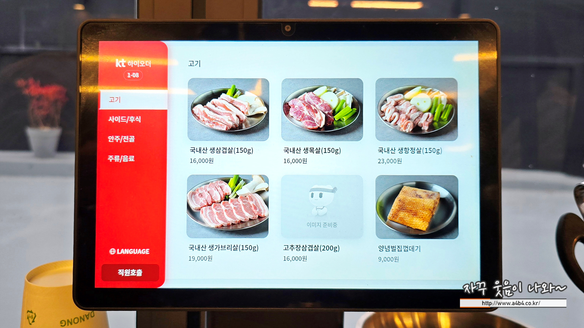 메뉴는 고기와 사이드 후식, 안주, 전골메뉴로 구성되어 있습니다. 메인 메뉴는 국내산 생삼겹살과 생목살, 생가브리살, 고추장삽겹살 등이 있고요. 주문은 테이블에 있는 태블릿에서 하시면 됩니다. 결제는 식사 끝나고 입구 카운터에서 하시면 되고요.