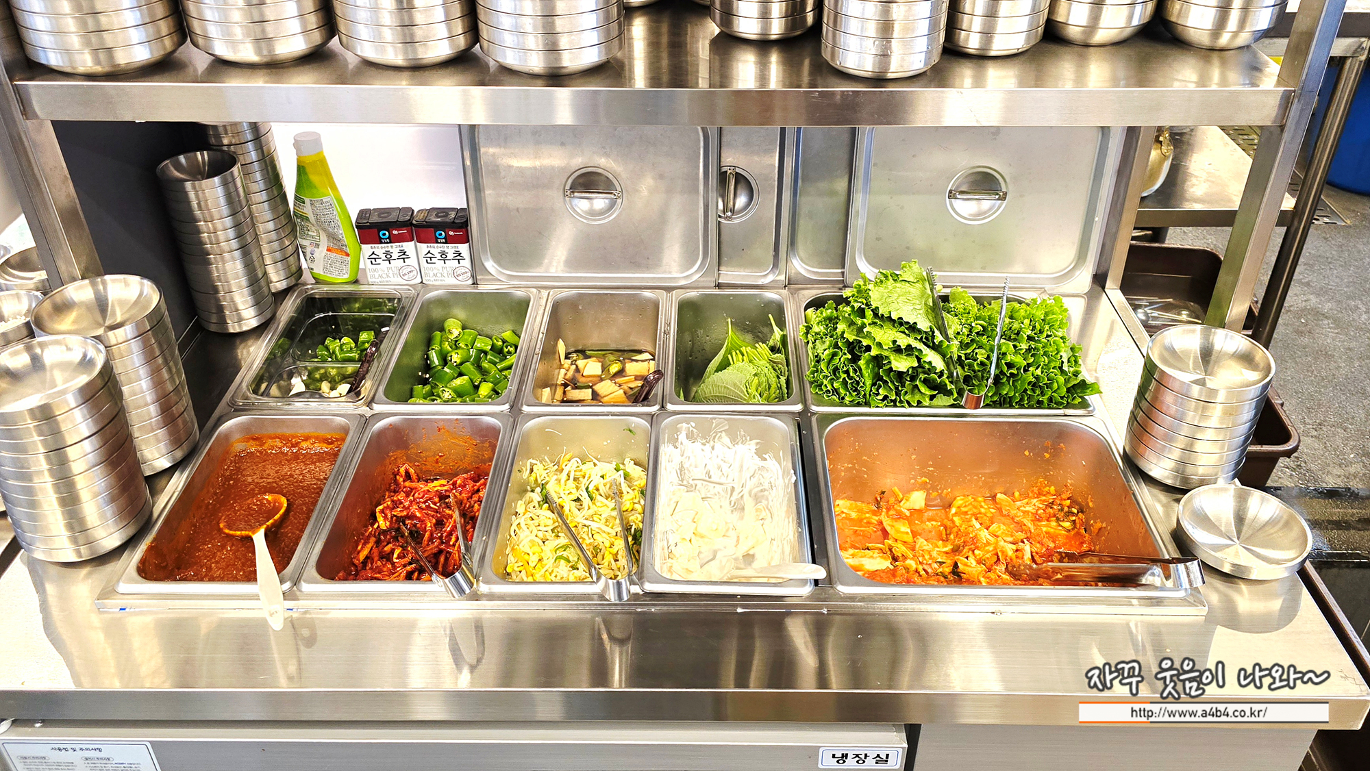 부족한 반찬은 식당 중앙에 있는 이곳에서 리필하시면 됩니다. 고기 반찬은 더 있군요.