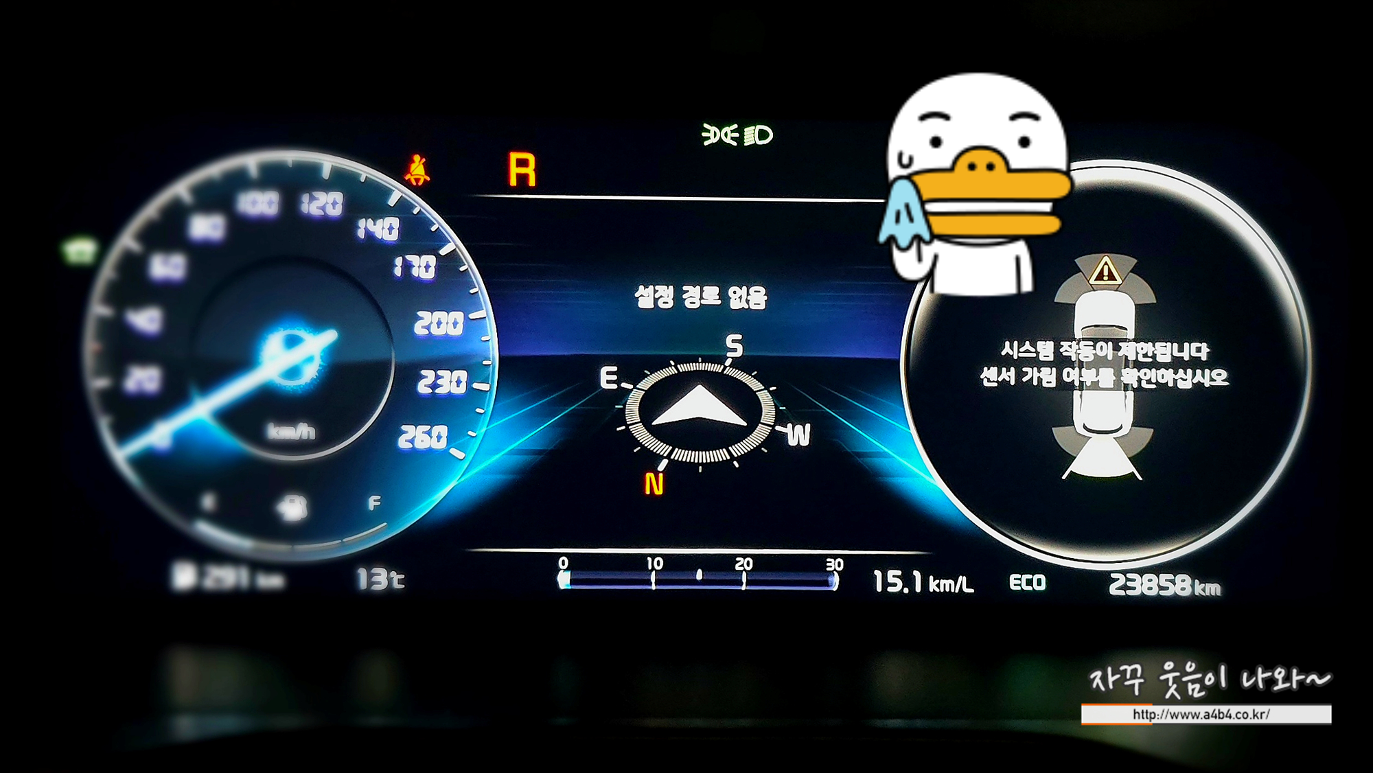 오류메시지와 함께 자동차 카메라와 센서를 상사용하는 기능들이 주행중에 모두 중단되었습니다.