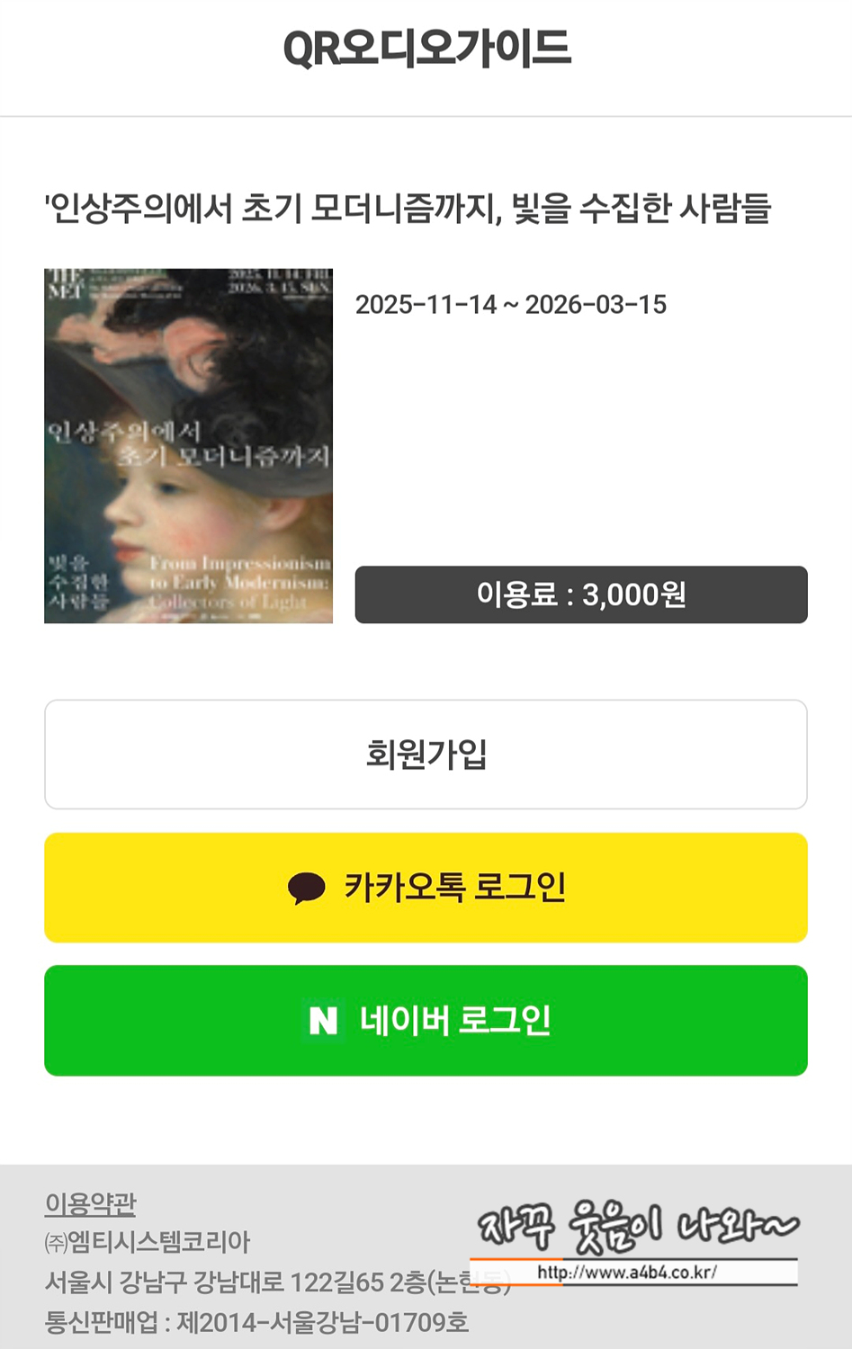 이번 메트로폴리탄박물관 소장 로버트 리먼 컬렉션 도슨트는 없고 두 가지 타입의 오디오 가이드가 유료로 제공됩니다. 먼저 오디오가이드 기기를 대여받아 감상하는 방법이 있습니다. 저는 남이 사용하던 기기 싫어서 선호하지는 않습니다. 이번 메트로폴리탄박물관 오디오가이드 기기 대여금액은 3,000원 입니다.